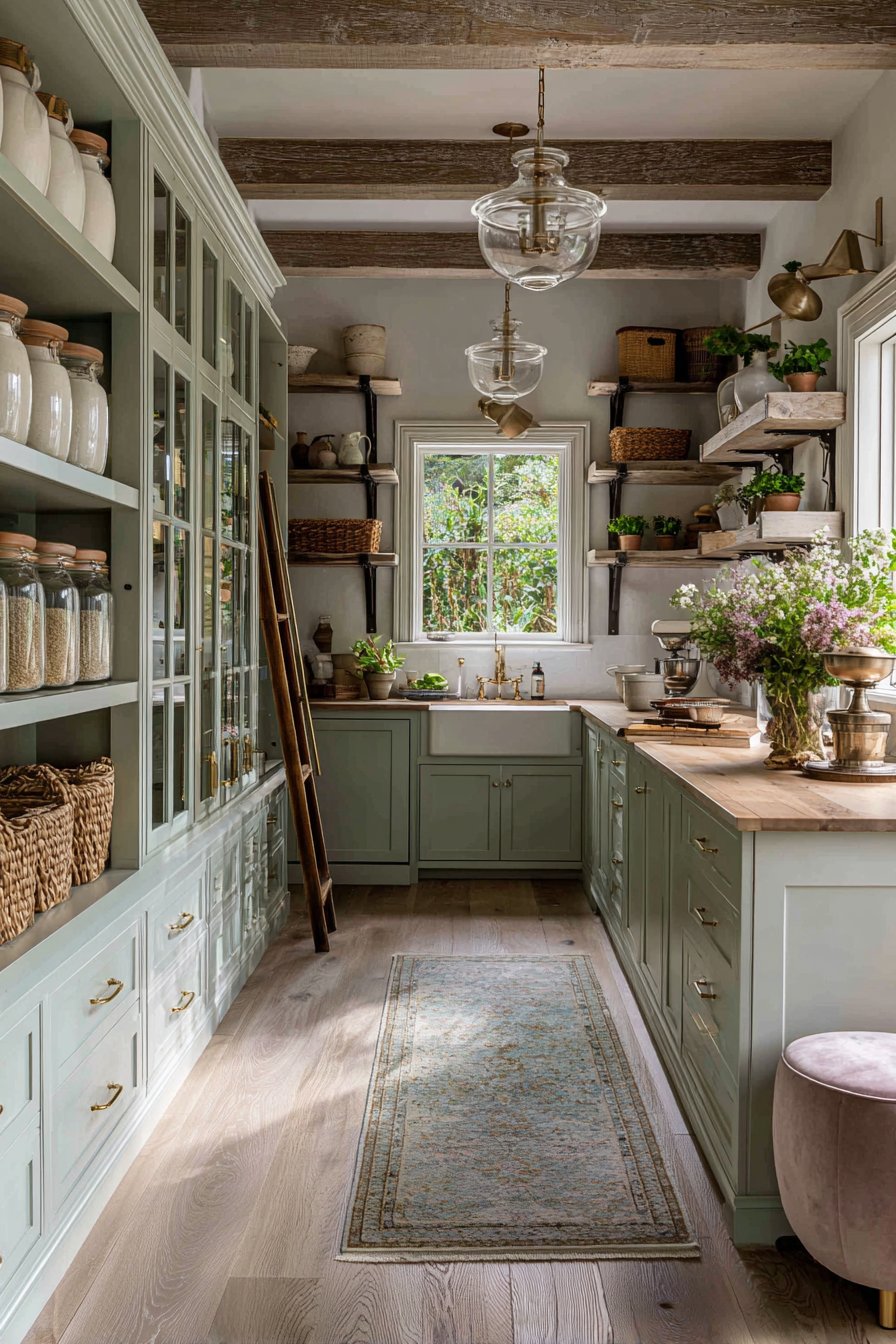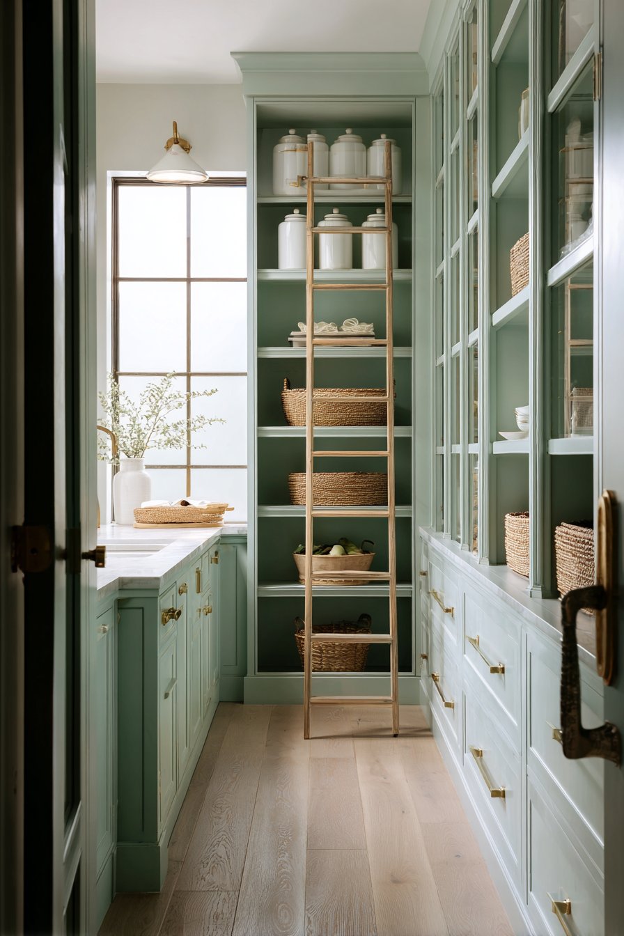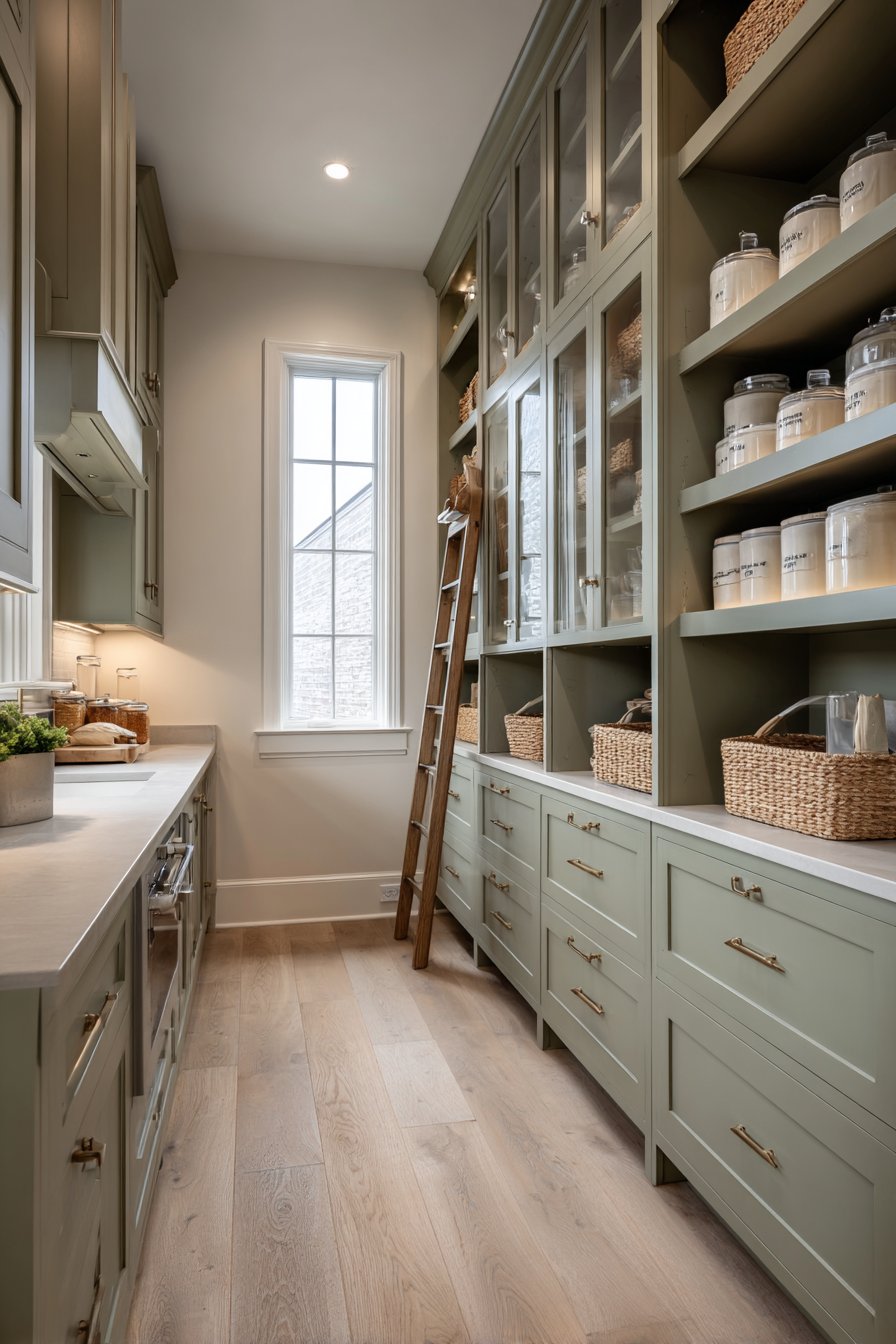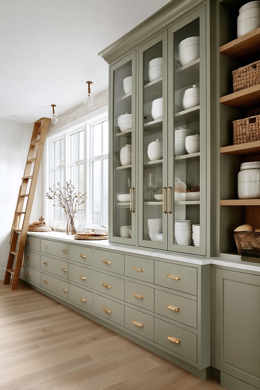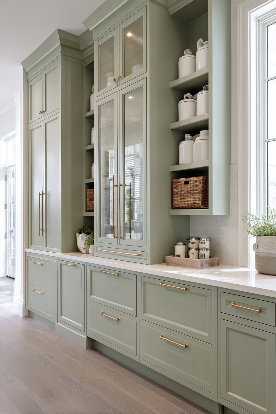 Floor-to-ceiling custom cabinetry in soft sage green creates an immediate visual impact. Brass cup pulls and knobs add warmth against the painted finish. The sophisticated color choice brings nature indoors while maintaining timeless elegance. Glass-front upper cabinets display neatly organized white ceramic canisters beautifully.