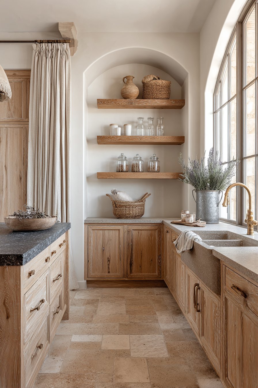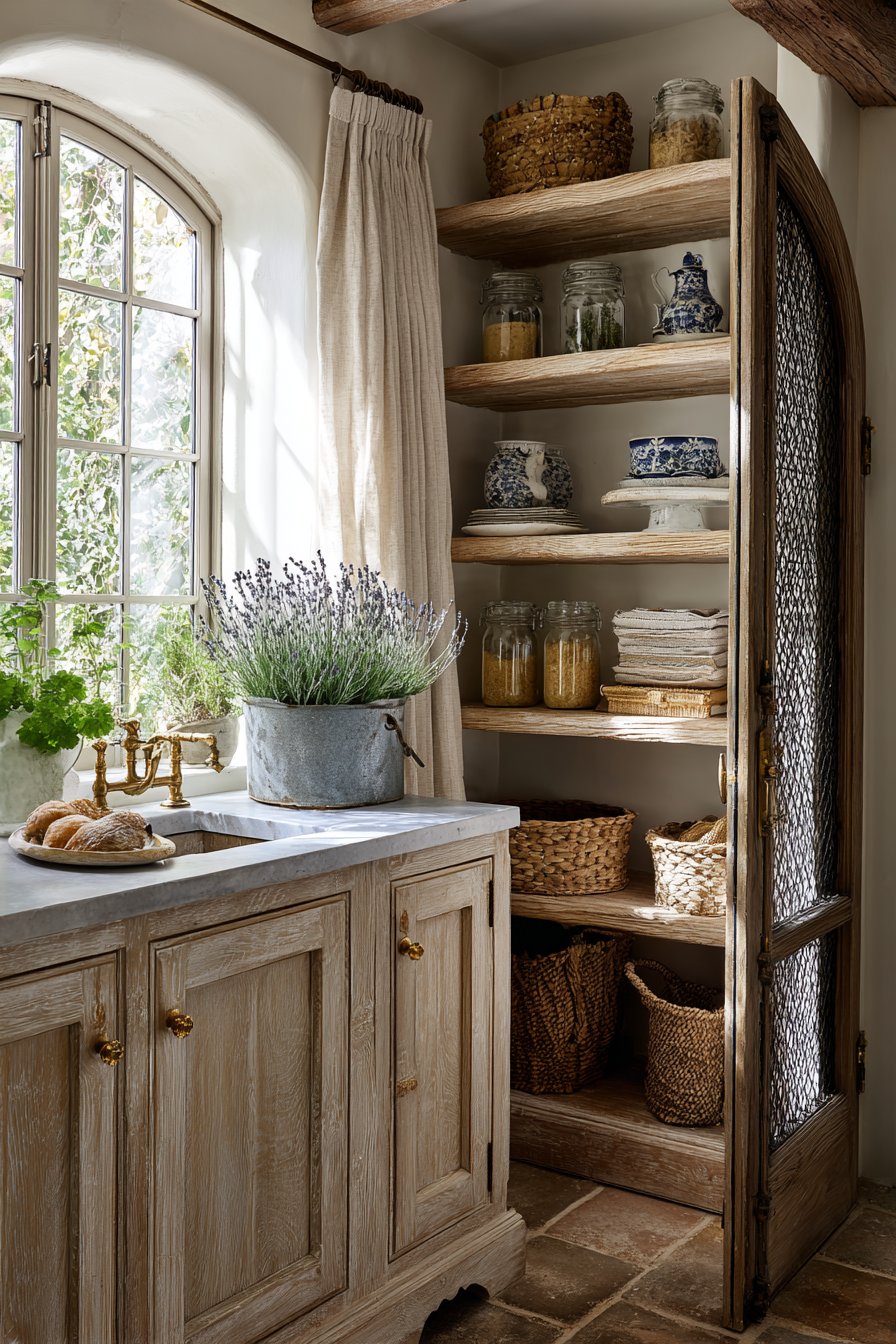 The slightly irregular surfaces show authentic traditional character. Rustic wood shelving with decorative corbels adds architectural interest. French pottery, woven baskets, and vintage glass jars create displays. A small farmhouse sink with exposed brass fittings provides utility.