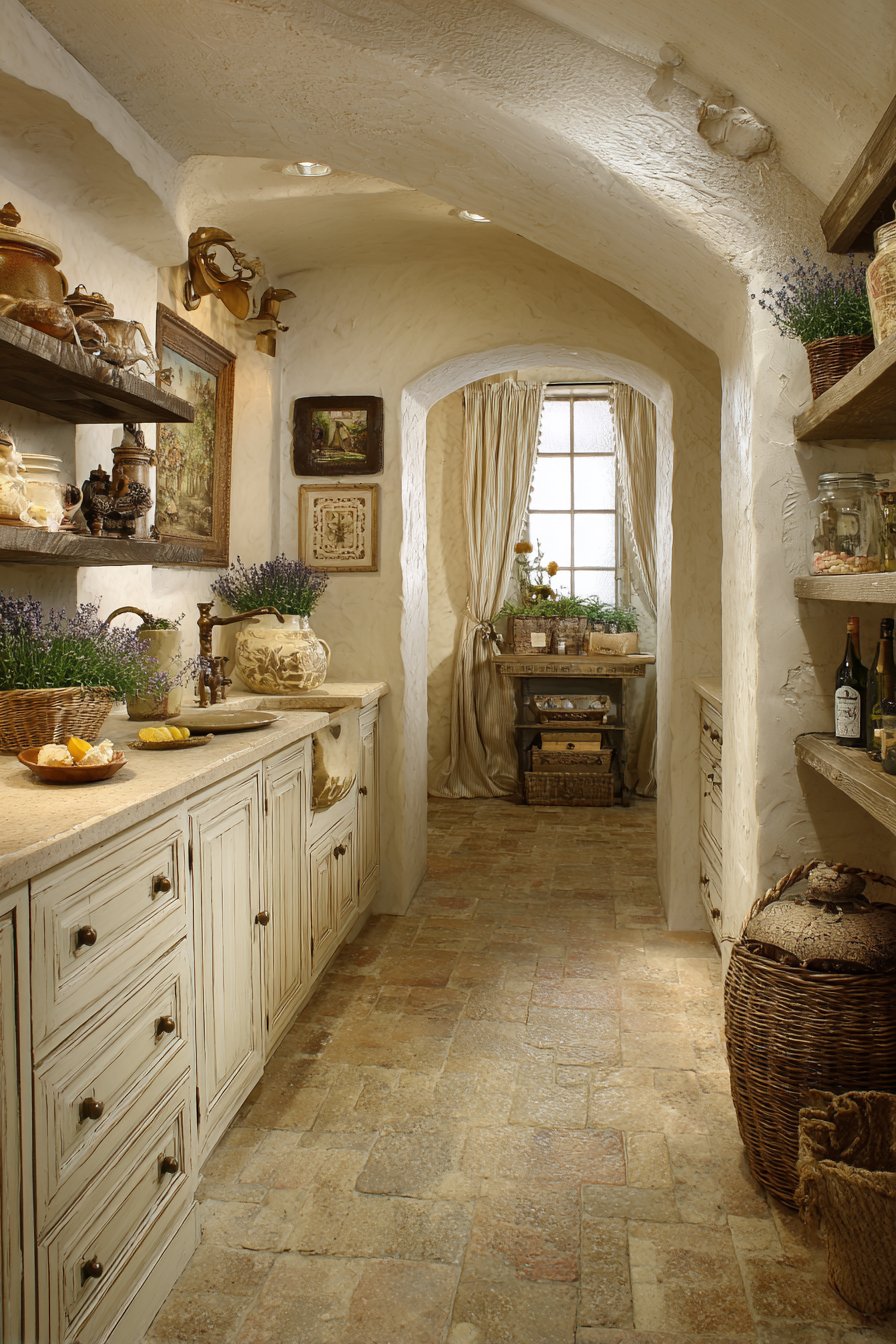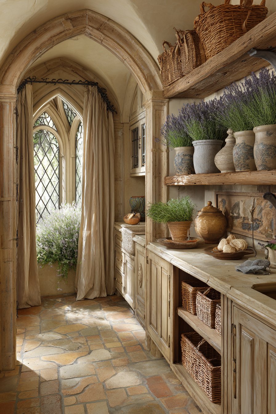 Bundles of dried lavender hang from wrought iron hooks. Fresh herbs grow in weathered zinc containers on the windowsill. Natural light filtered through linen curtains creates soft illumination. This design transports you to the French countryside immediately.