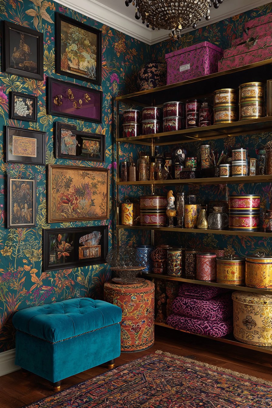 A gallery wall of framed vintage botanical prints creates visual interest. Food-related artwork adds personality and conversation starters. Opposite wall features white floating shelves with black metal brackets. Color-coordinated storage containers are arranged by height and use frequency.
