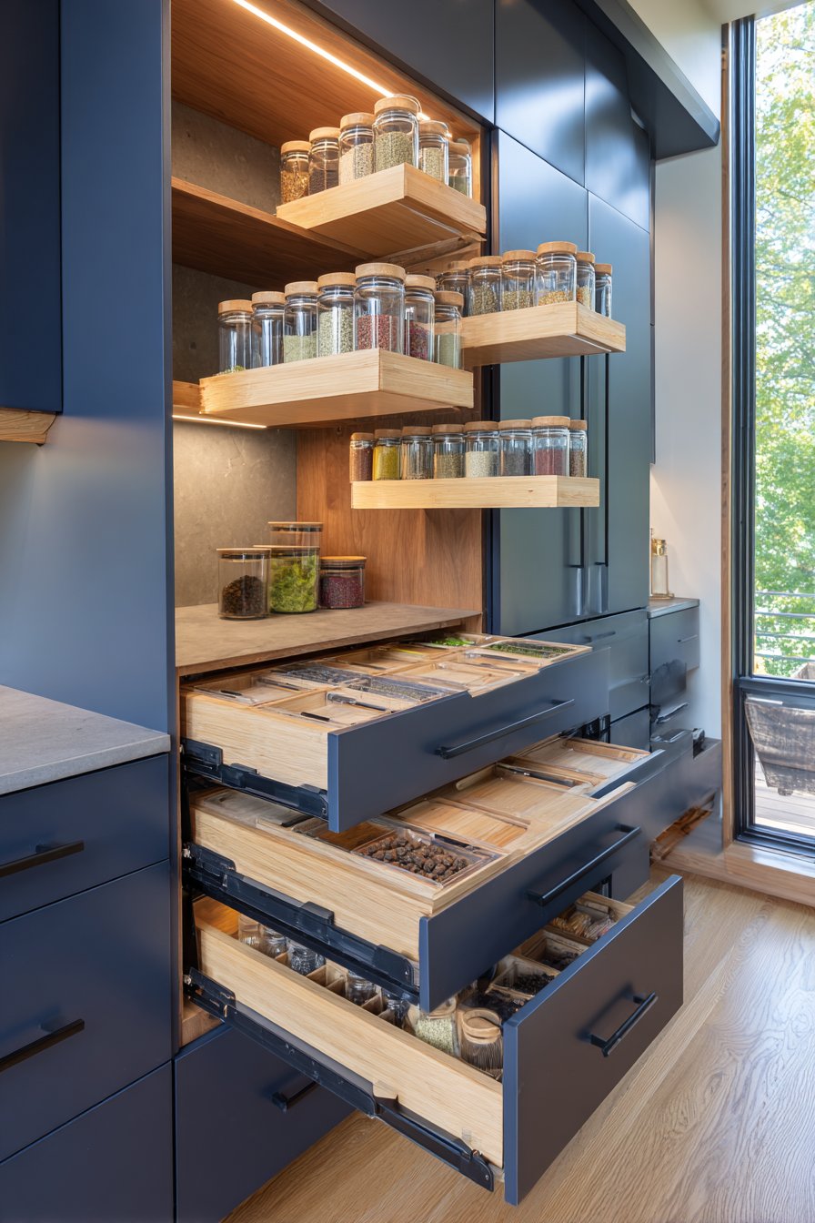 Matching clear glass containers with bamboo lids create cohesion. Custom drawer organizers feature specific dividers for efficiency. Pull-out spice rack in navy finish provides easy cooking access. Large-format grey porcelain tiles mimic concrete texture subtly.