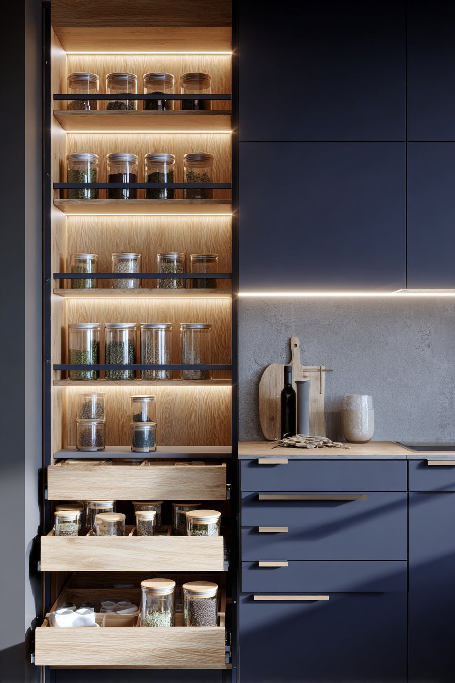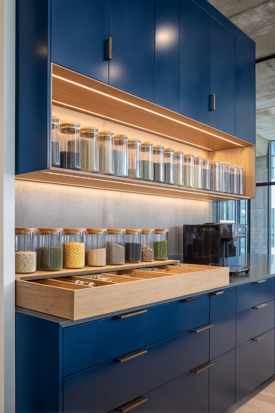 Matte navy blue lower cabinets create grounding modern foundation. Light natural oak open shelving above adds warmth and airiness. The two-tone combination balances cool and warm beautifully. Integrated LED lighting strips illuminate organized glass containers.