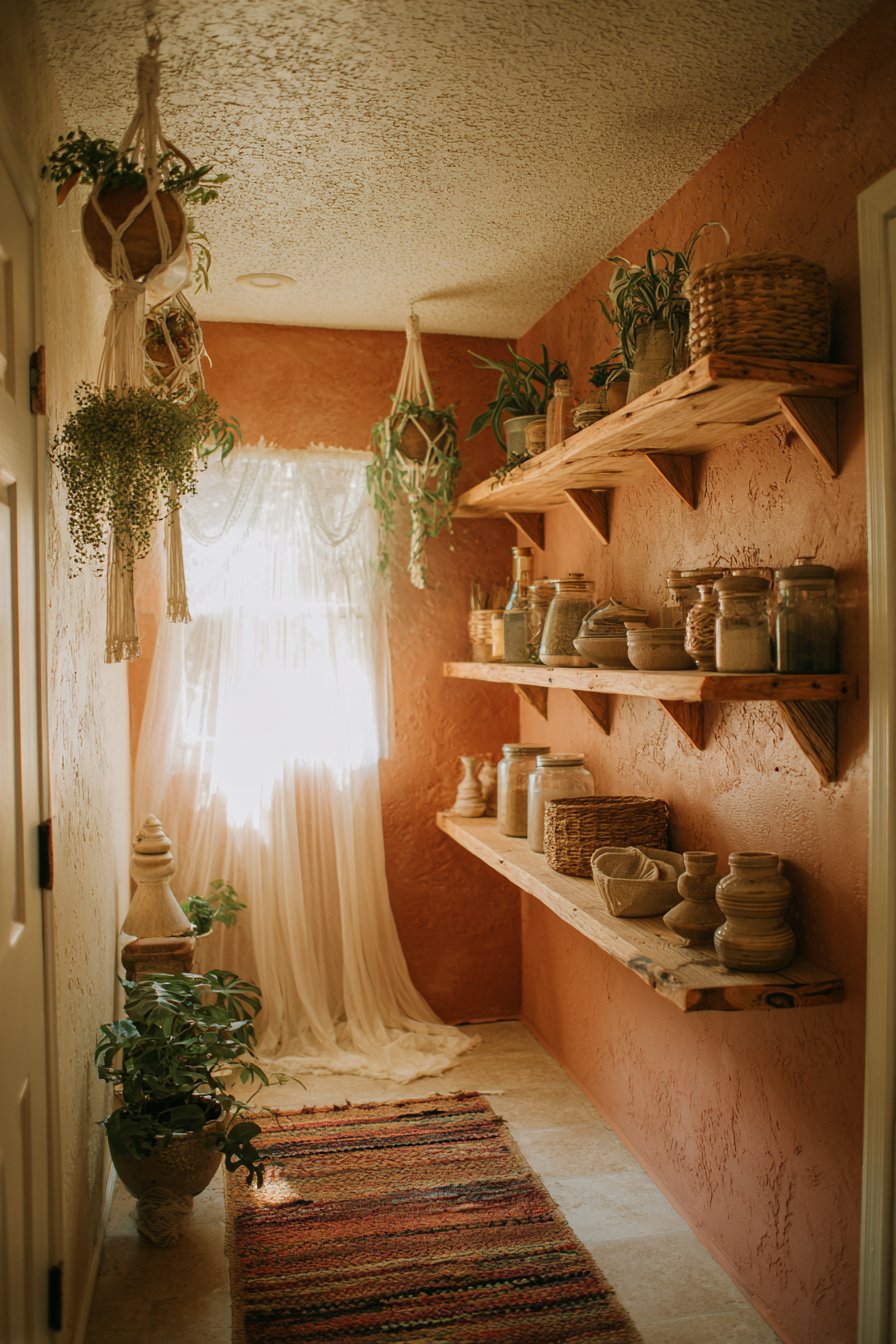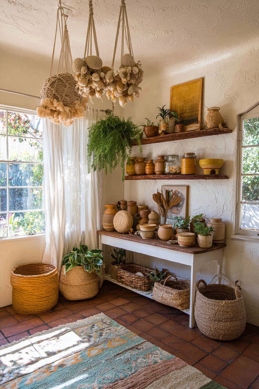 Trailing pothos and hanging ferns add life and greenery abundantly. Natural light through gauze curtains creates an ethereal quality. The free-spirited aesthetic celebrates organic materials and personal expression. This design feels collected over time rather than purchased at once.