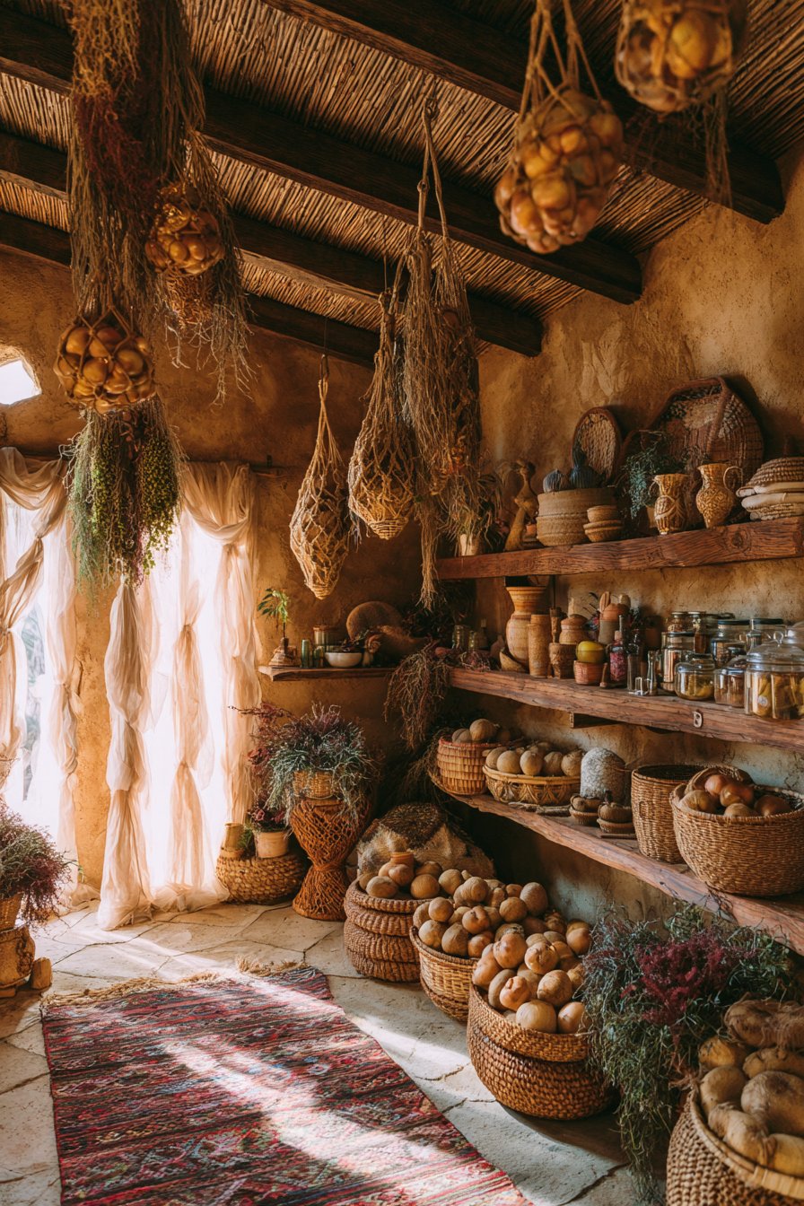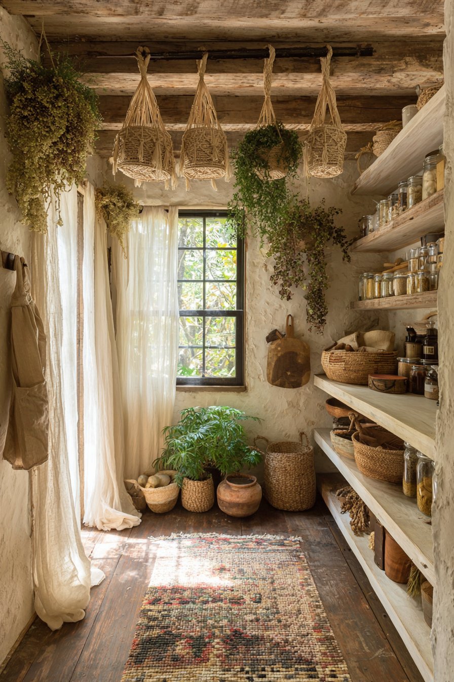 Macrame hanging baskets suspend from ceiling hooks artistically. They hold onions and garlic in functional artistic display. Rough-hewn wood shelves in varying lengths create an asymmetric arrangement. The intentional irregularity adds bohemian character beautifully.
