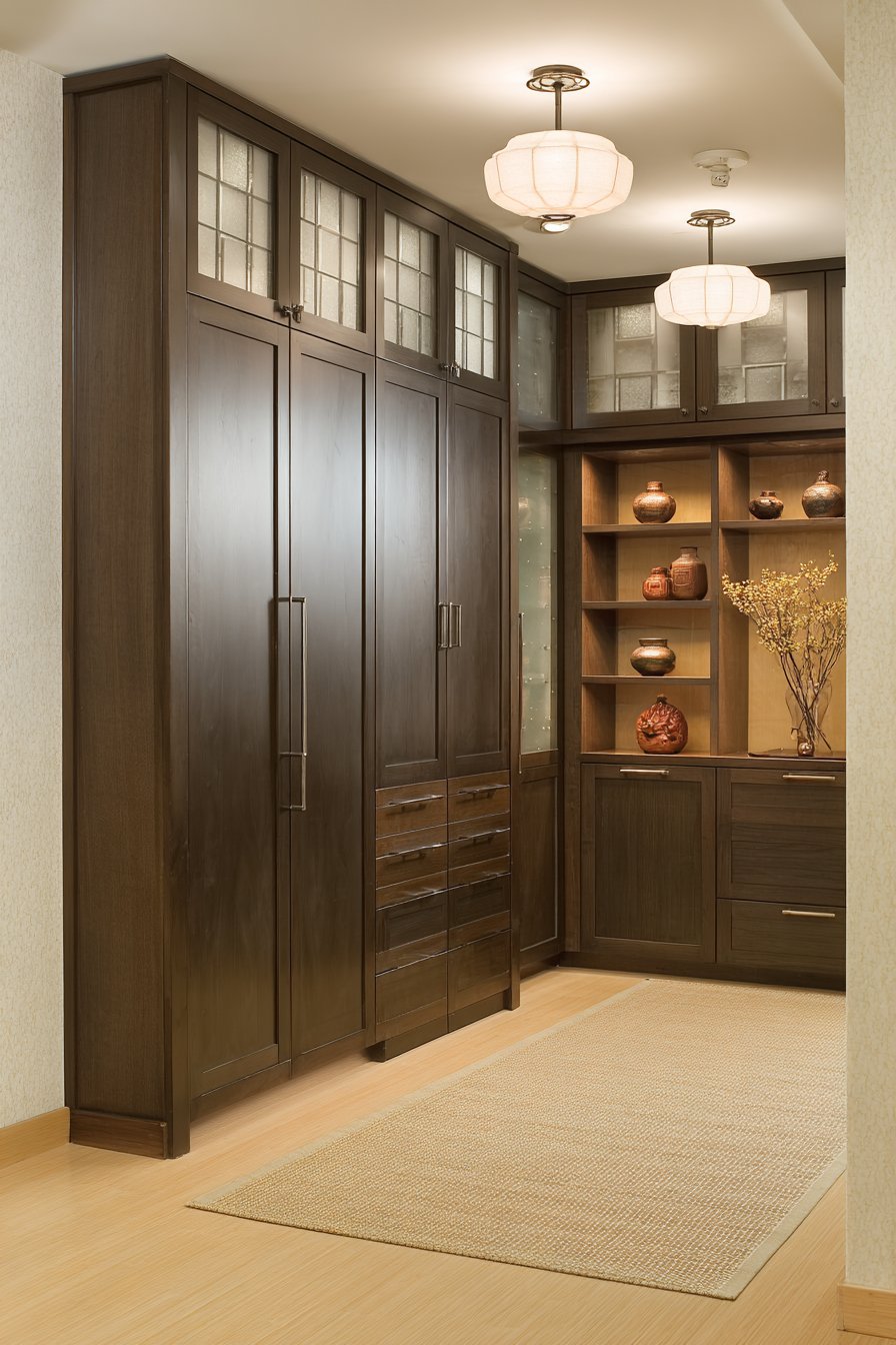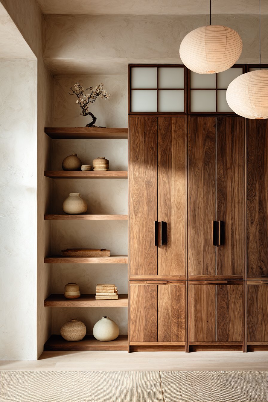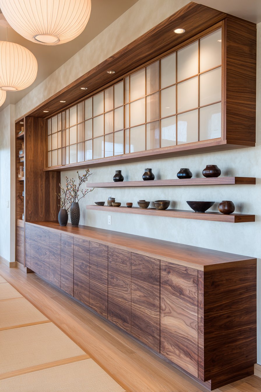 Custom cabinetry in medium-toned walnut shows beautiful grain patterns. Simple recessed pulls maintain clean minimalist lines. Shoji-screen-inspired translucent panels allow soft light diffusion. They conceal contents while maintaining brightness and openness.