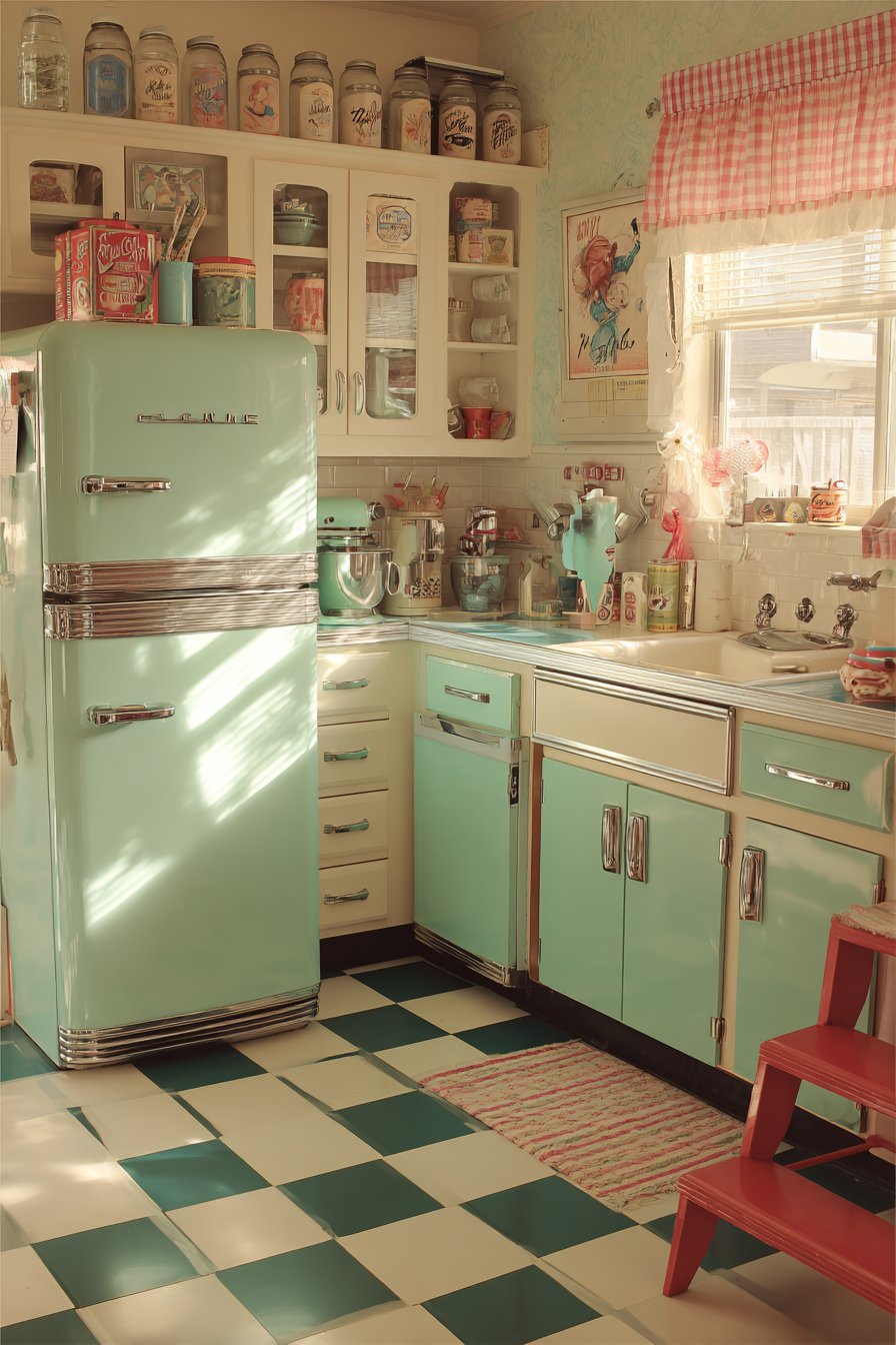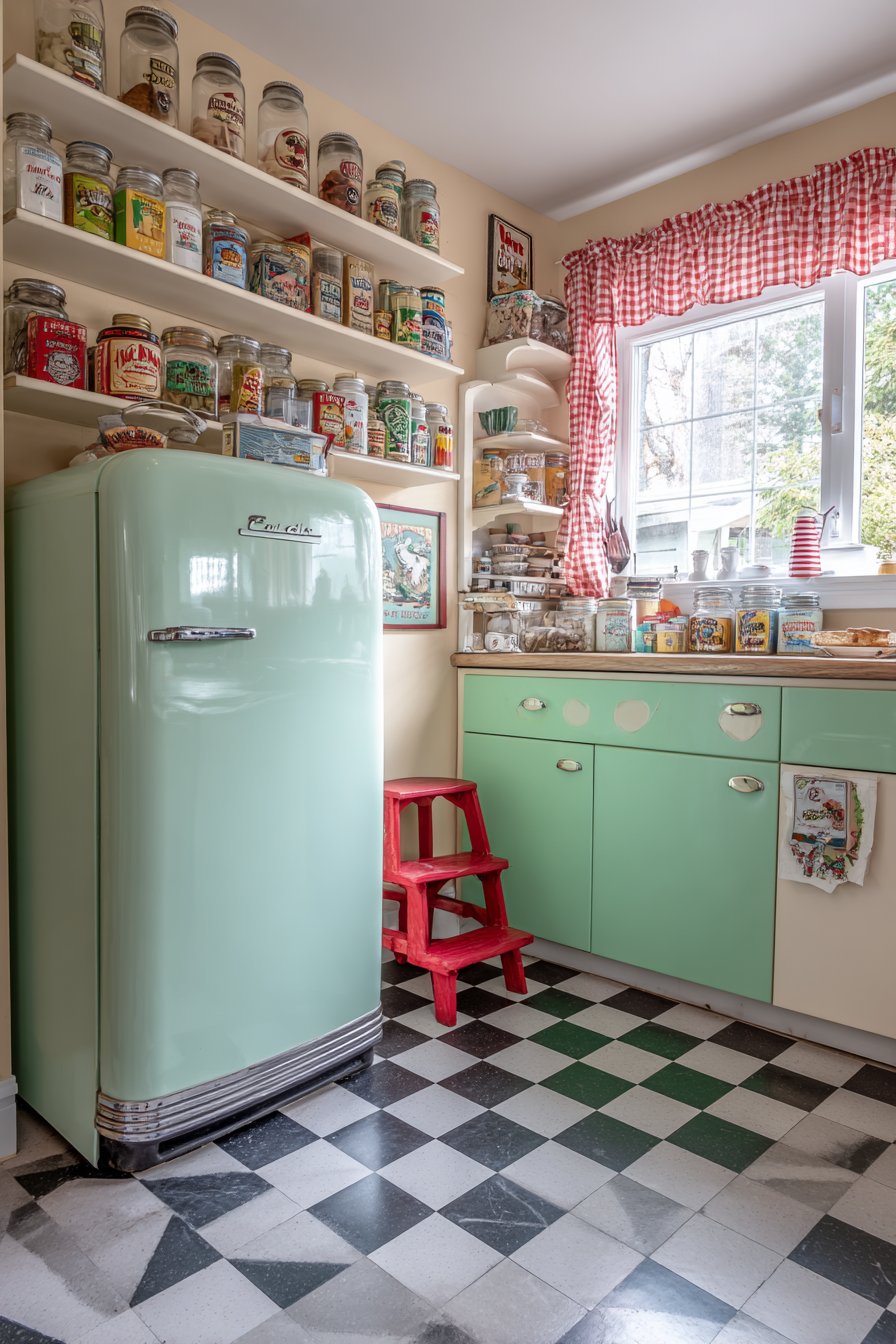 Period packaging adds to the mid-century time capsule effect. A vintage red step stool provides colorful functional access. Soft natural light through gingham cafe curtains filters beautifully. This design celebrates mid-century charm with authentic vintage elements.