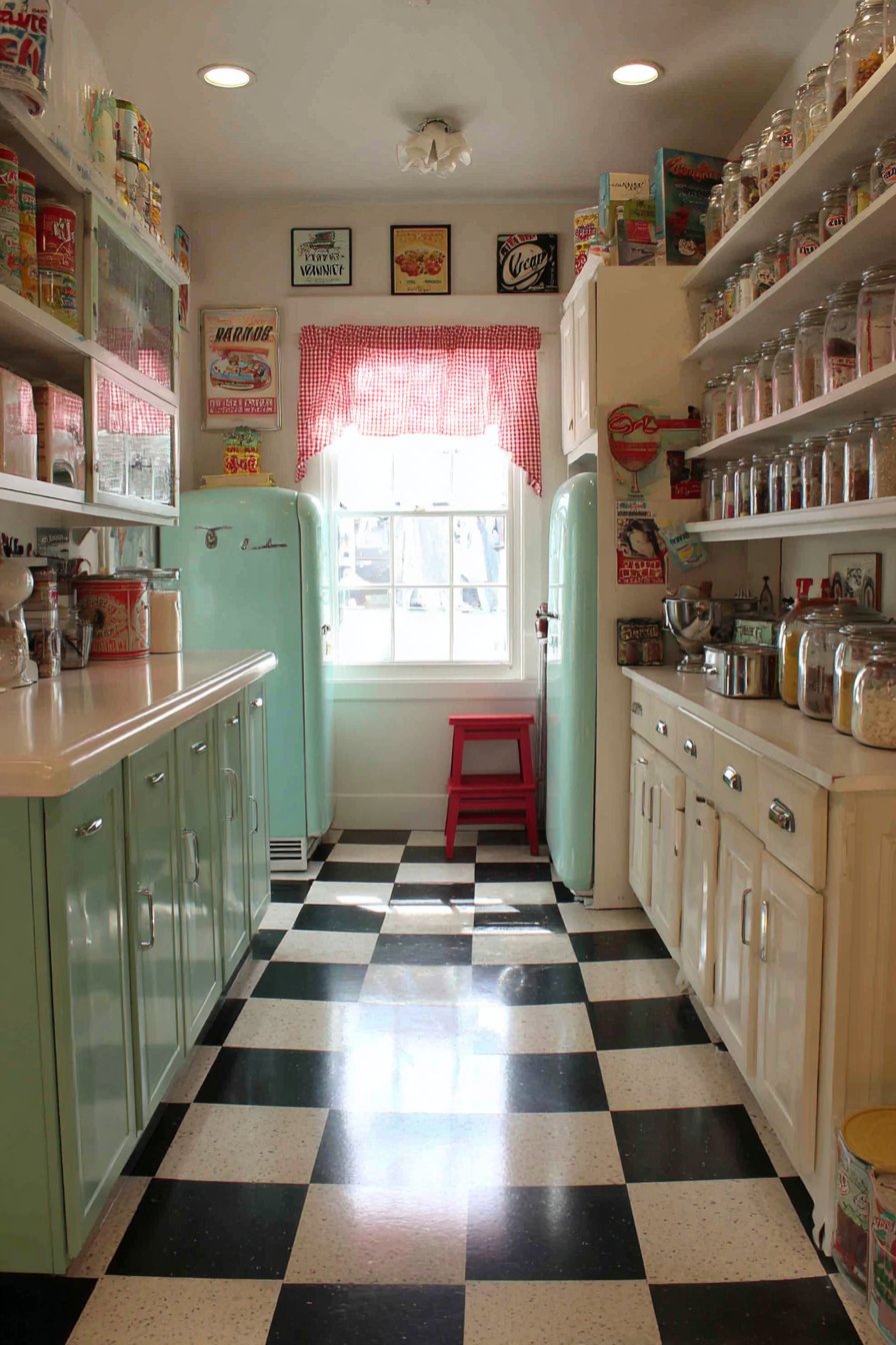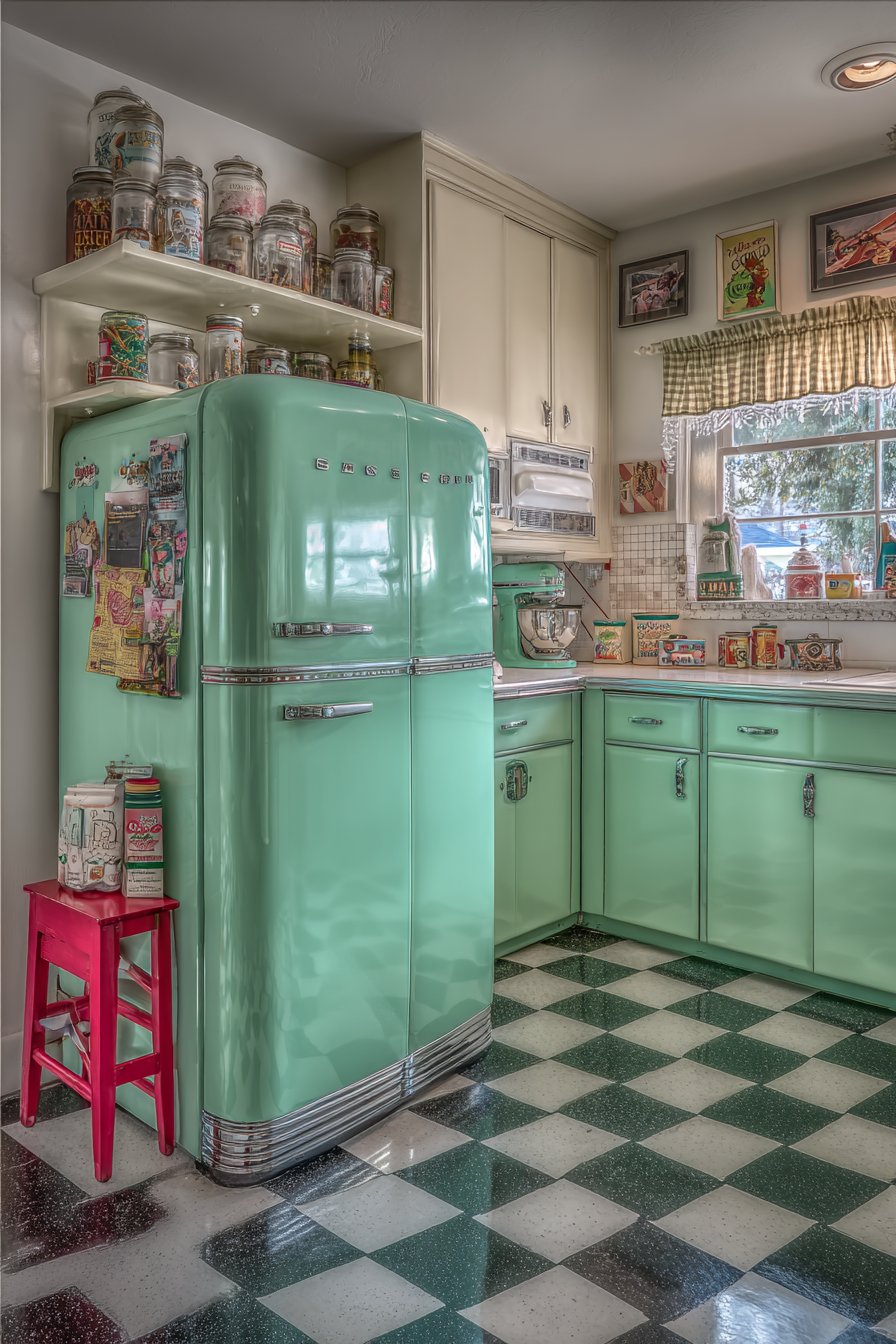 Open shelves painted in coordinating cream complement mint perfectly. A vintage-style refrigerator in matching mint completes the look. Black and white checkerboard linoleum shows subtle authentic wear. Retro advertising tins create nostalgic charming displays.