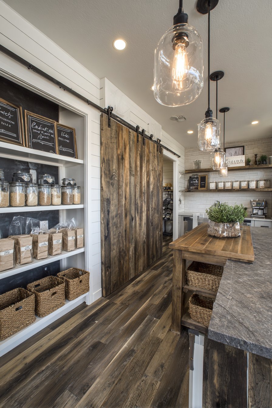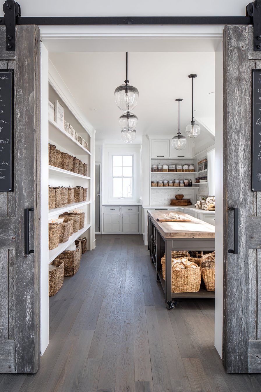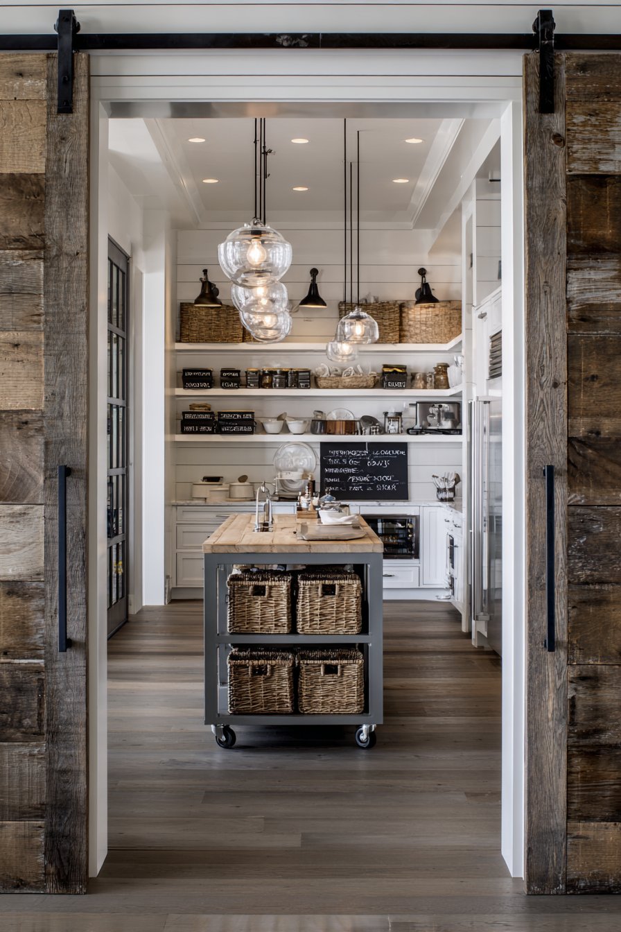 Floor-to-ceiling sliding barn doors in reclaimed wood create drama. They conceal storage area when desired for clean appearance. Inside, white painted shiplap walls provide neutral bright backdrop. Organized shelving combines open and closed storage smartly.