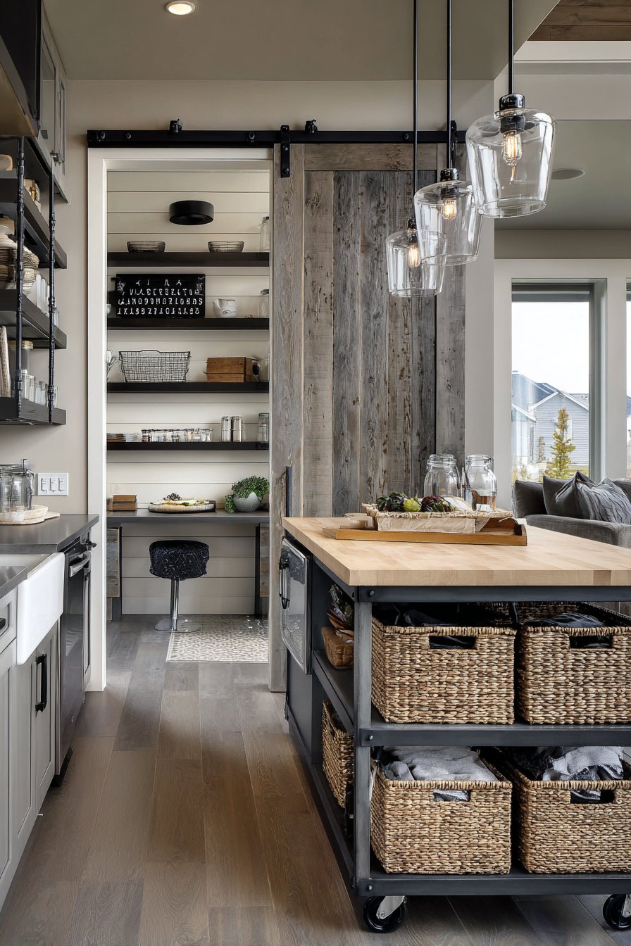 Wicker baskets with chalkboard tags maintain cohesive flexible organization. A small butcher block island on wheels centers the space. It offers an additional prep area and mobile storage convenience. Pendant lights with clear glass shades hang attractively above.