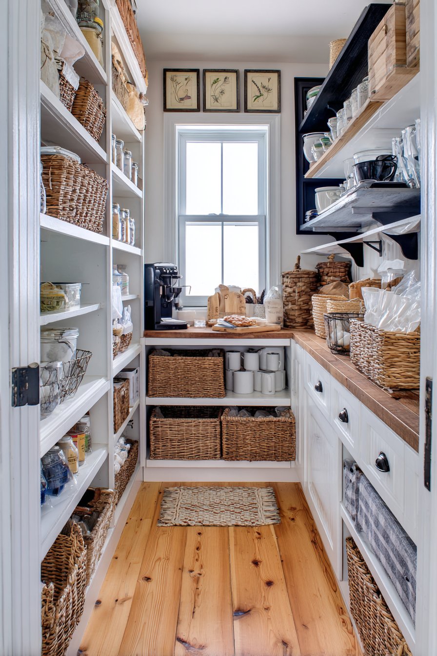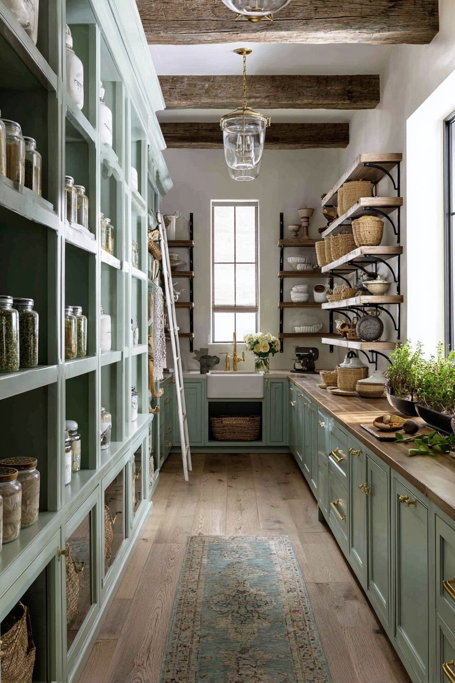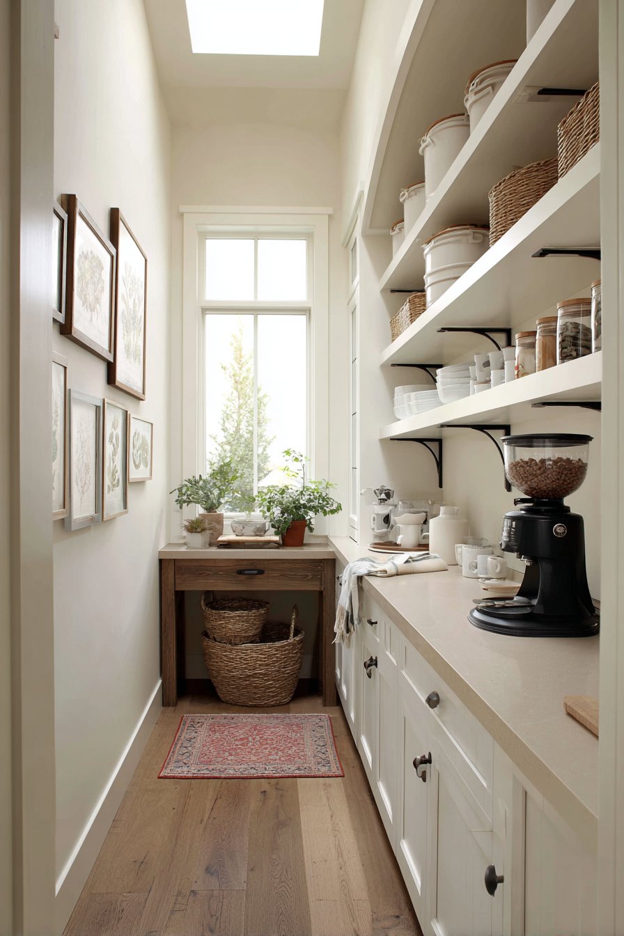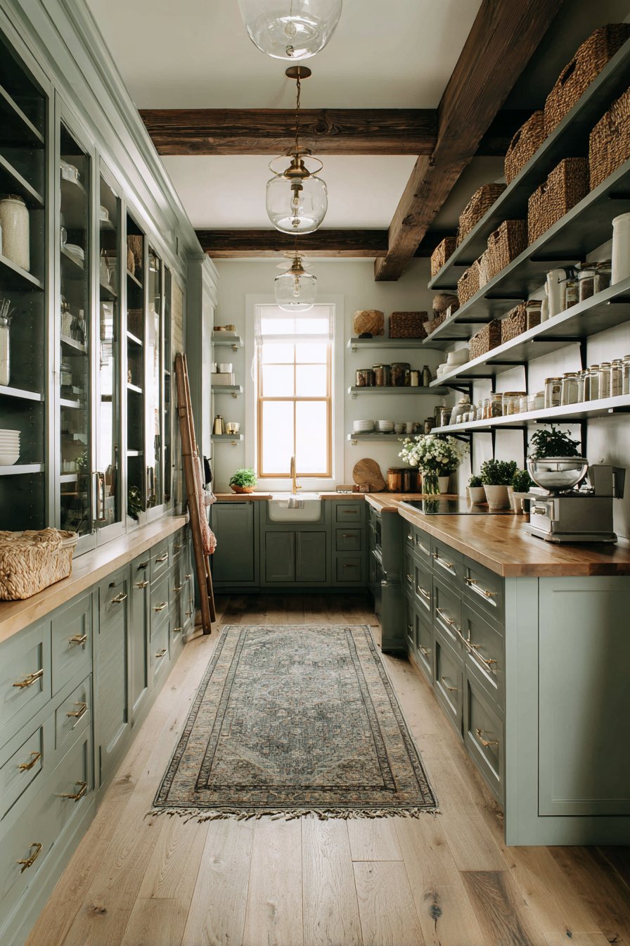 A small vintage rug adds pattern and softness underfoot. Natural light from transom windows above creates soft illumination. The personalized aesthetic balances functional storage with curated display. This design proves pantries can showcase personal style beautifully.