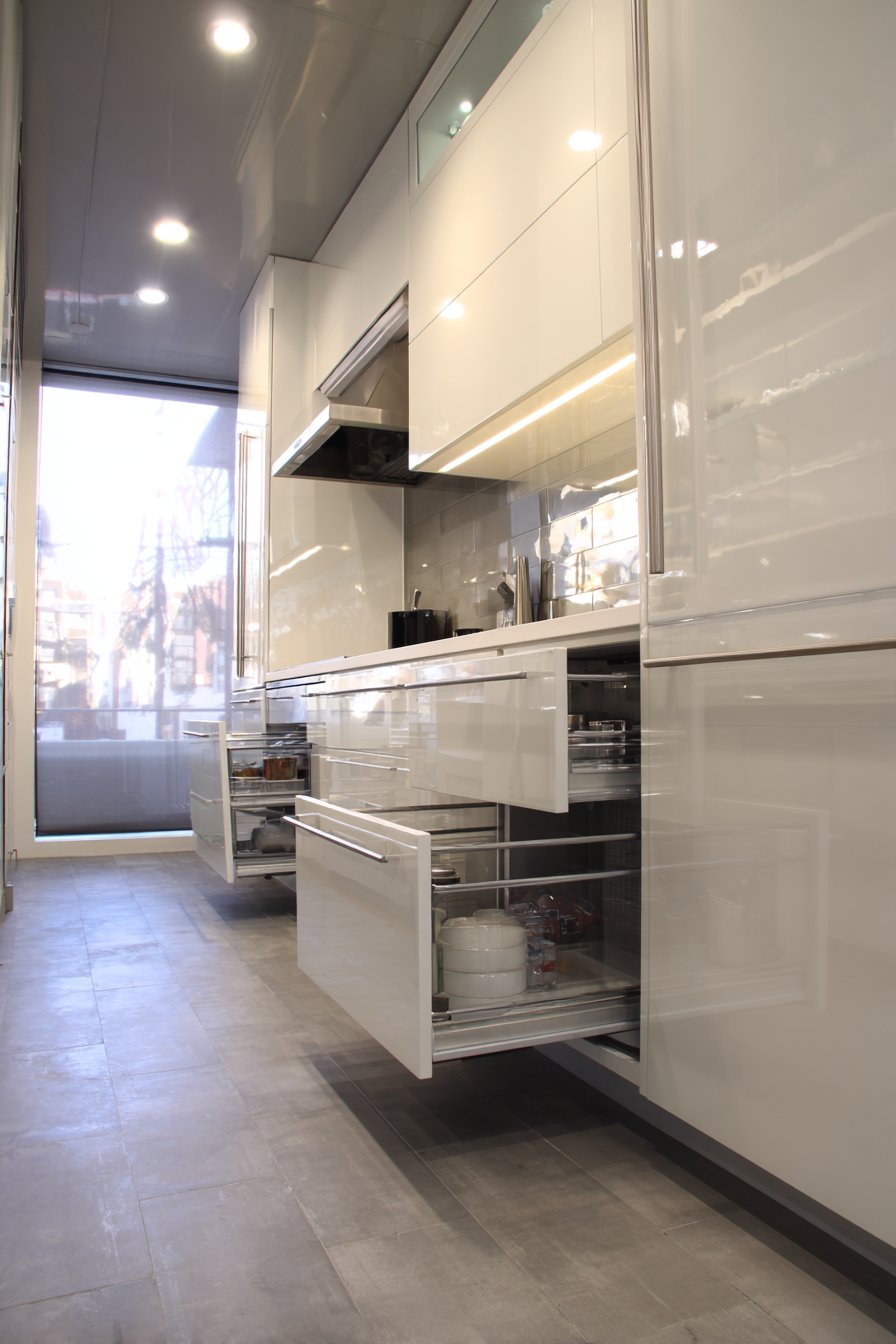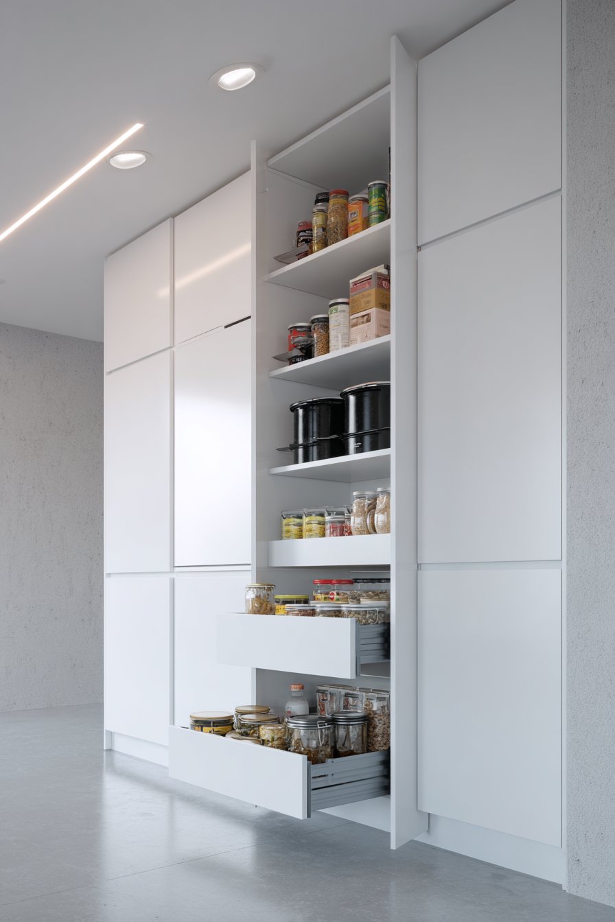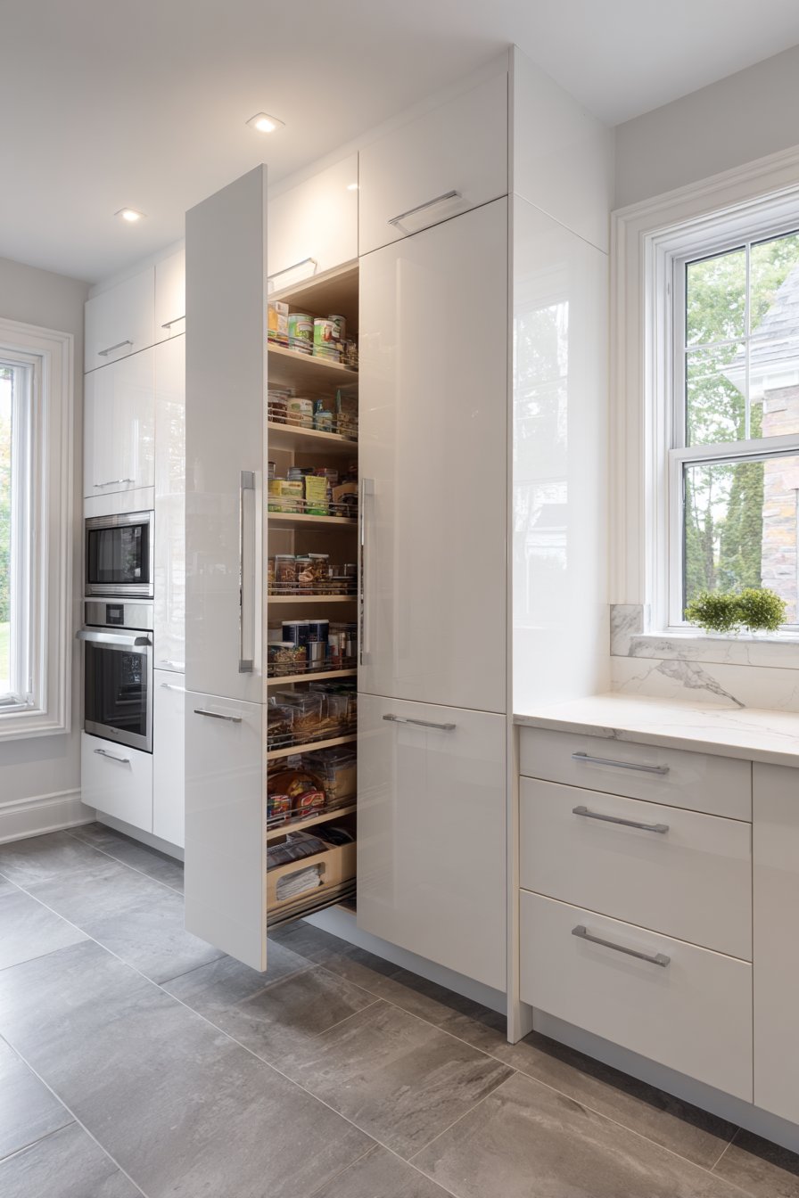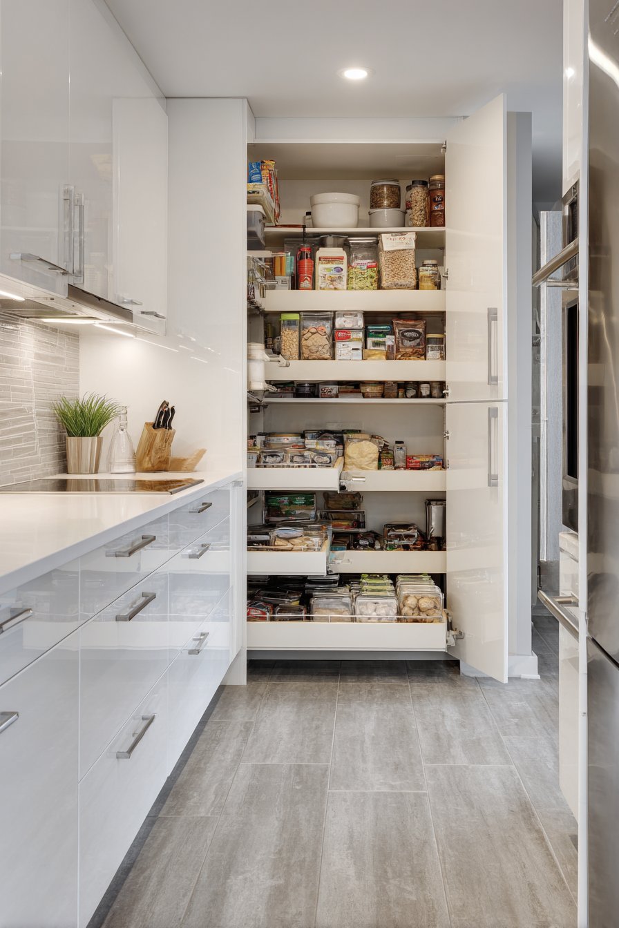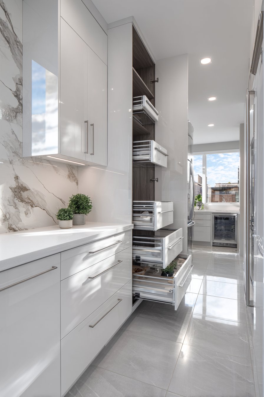 High-gloss white cabinetry reflects light throughout compact space. Integrated handles create continuous, streamlined surfaces. The reflective quality makes small spaces feel larger and brighter. Pull-out pantry units with multiple tiers maximize vertical storage.
