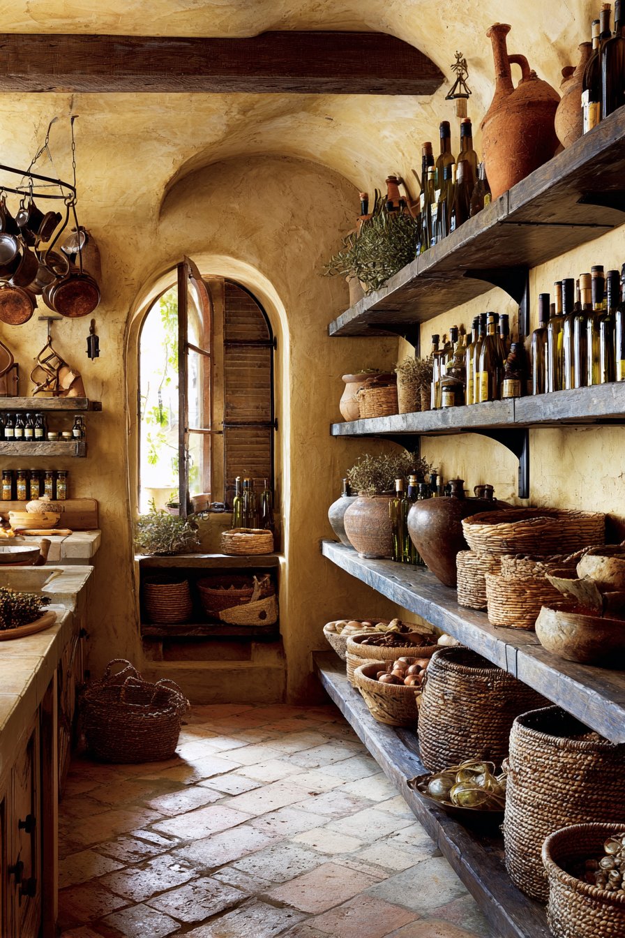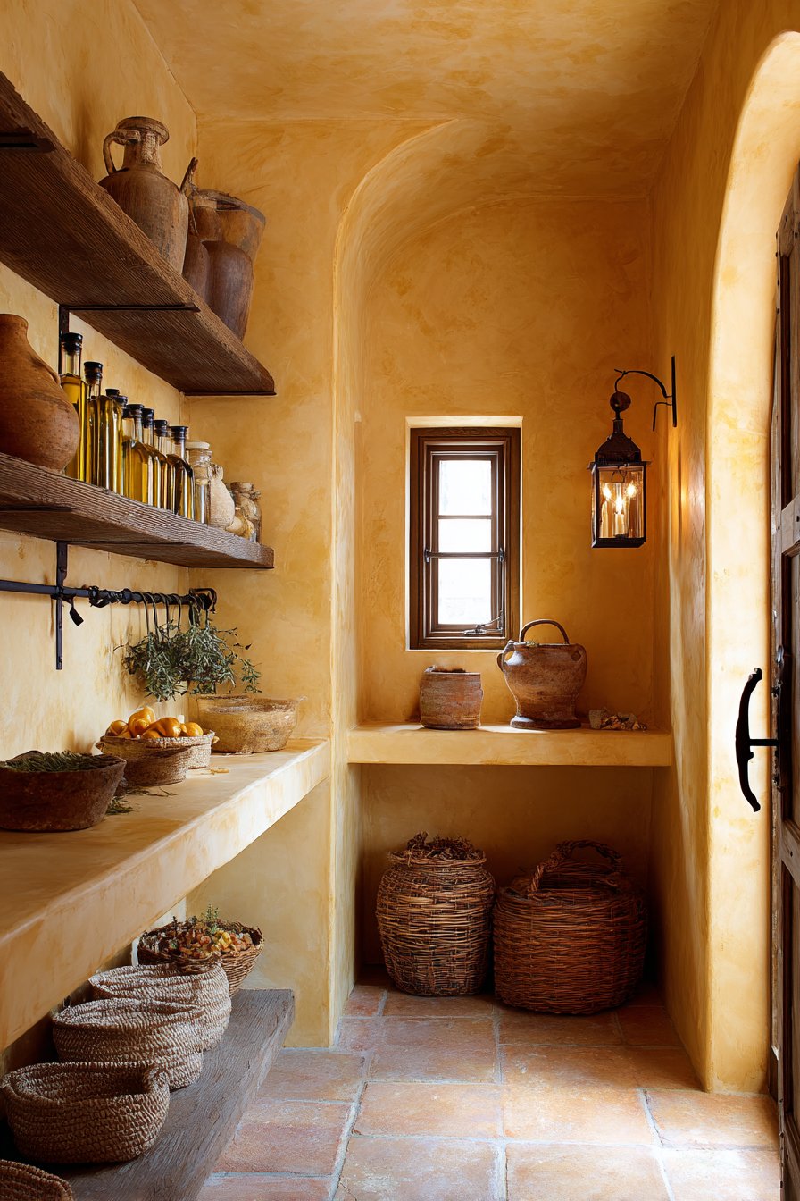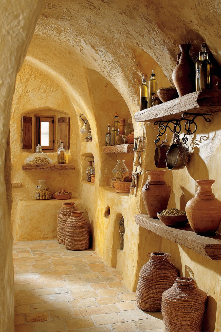 Rustic plastered walls in warm ochre show natural texture variations. Subtle color shifts add authentic handcrafted character throughout. Arched niches built into walls display bottles and preserves. Olive oil, wine, and preserved goods become art objects.