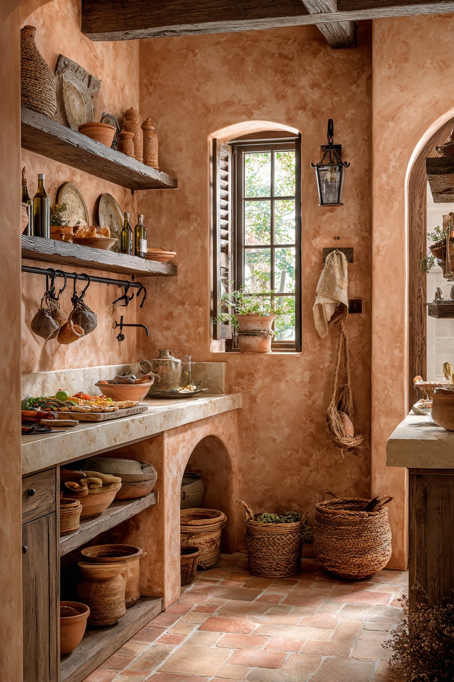 Wrought iron hooks hold copper pots and dried herb bundles. A small window with wooden shutters allows dappled natural light. The old-world aesthetic celebrates artisanal craftsmanship and aged materials. This design transports you to Mediterranean countryside immediately.