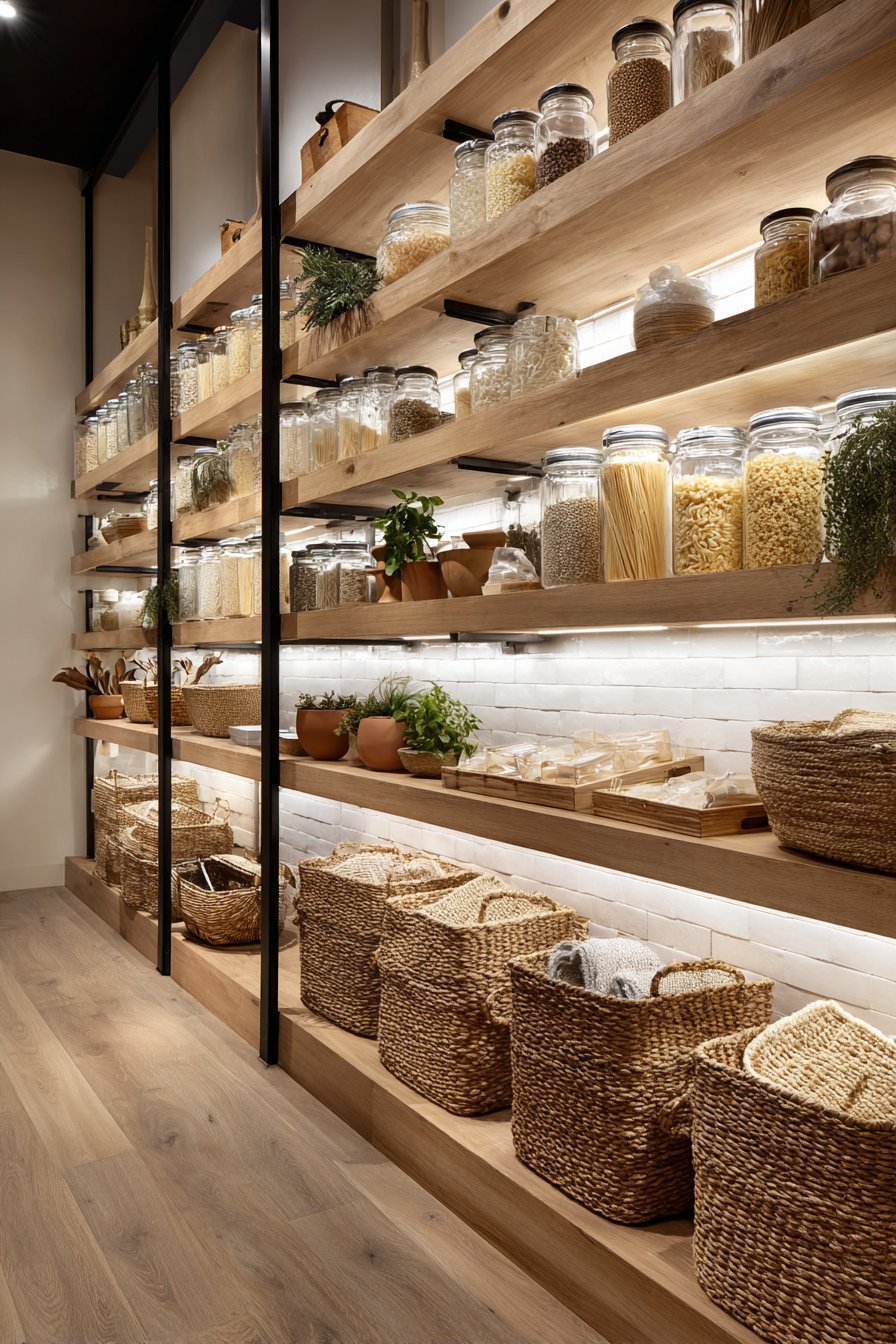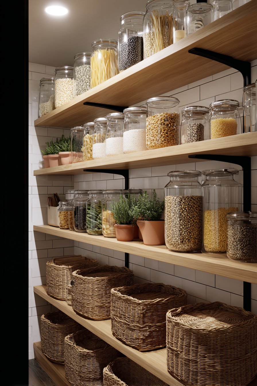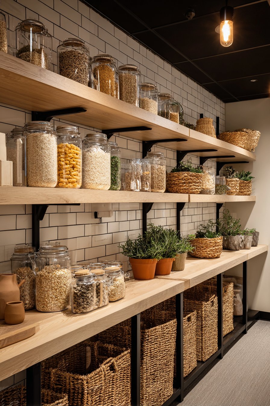 Modern open shelving in natural white oak creates an airy feel. Matte black metal brackets provide strong contrast and contemporary edge. Glass storage jars filled with pasta and grains become decorative elements. Potted herbs in terracotta containers bring life and freshness.