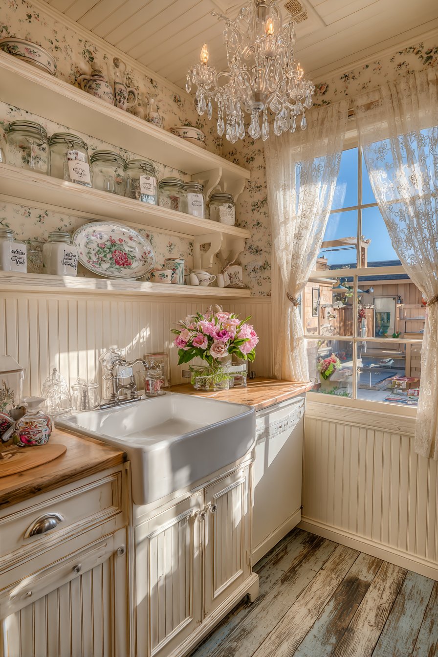 Vintage-inspired wallpaper with botanical print covers upper walls. Wide-plank pine painted in soft grey-blue creates foundation. Lace curtains filter light from the casement window delicately. A crystal chandelier adds unexpected elegant sparkle above.