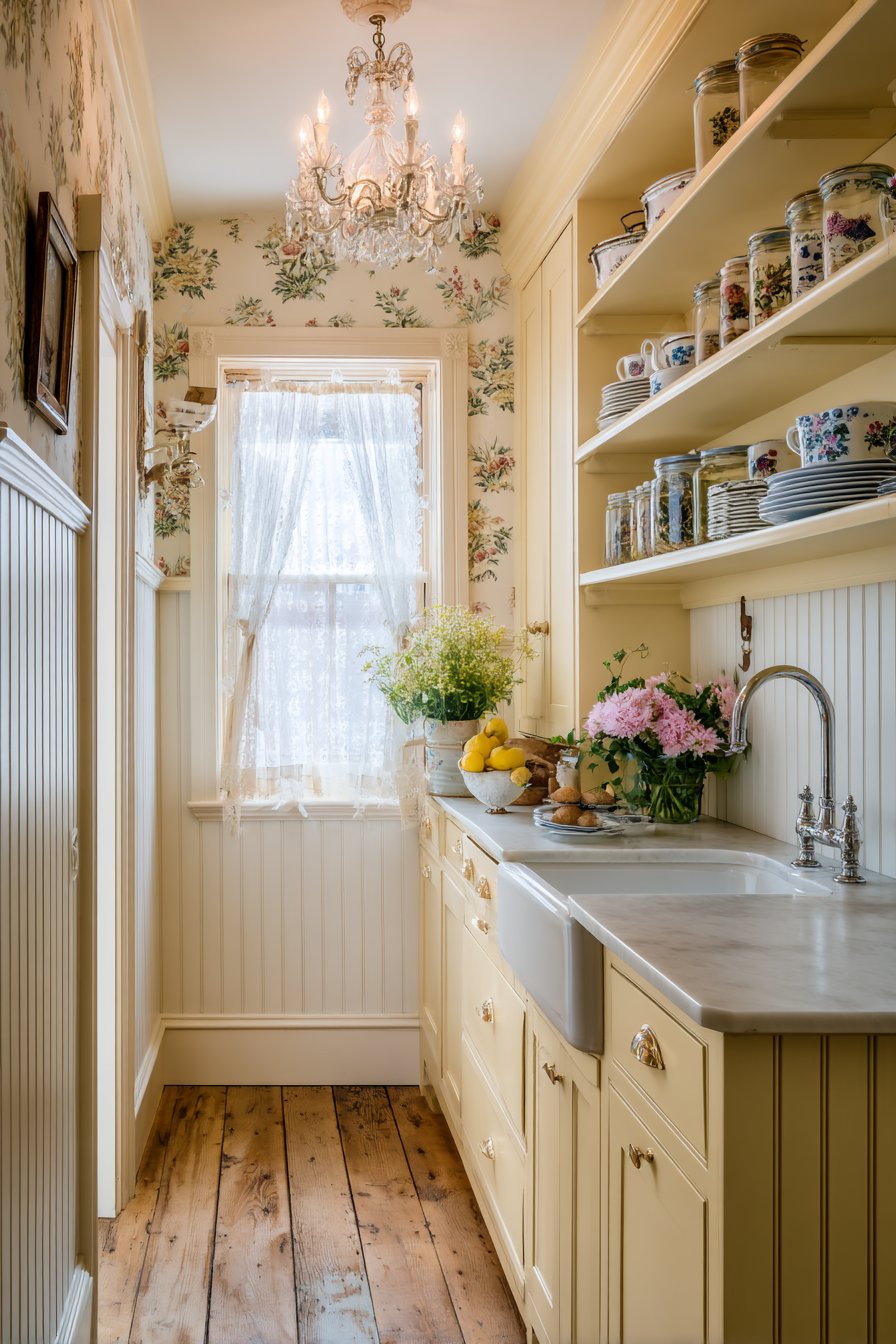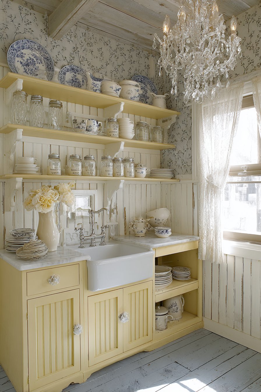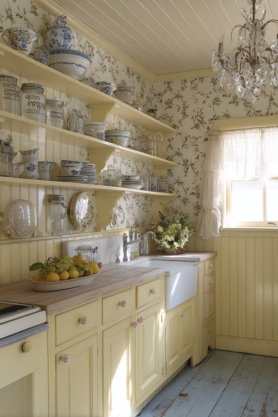 Painted wood cabinetry in soft butter yellow radiates sunshine. Porcelain knobs featuring delicate floral patterns add feminine detail. The romantic cottage aesthetic feels warm and inviting immediately. Open shelving above displays transferware china and vintage jars.
