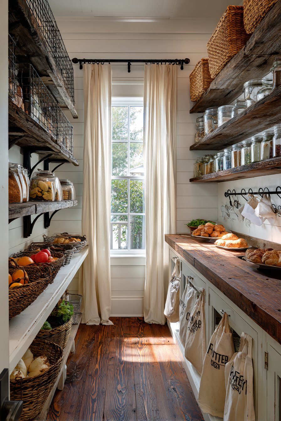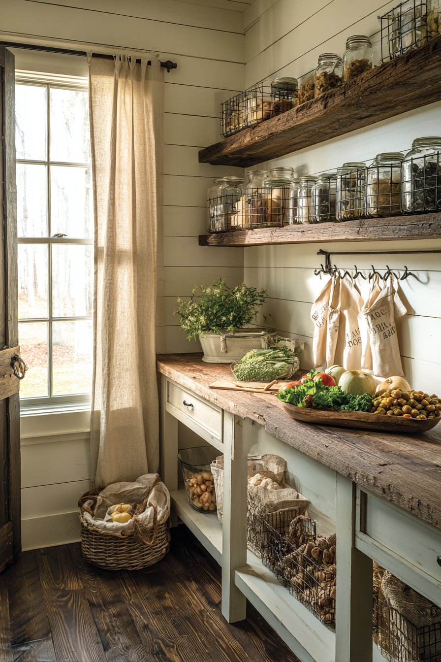 Shiplap walls painted in Benjamin Moore Simply White create classic farmhouse appeal. Reclaimed wood floating shelves feature visible grain and natural edge details. The contrast between painted walls and raw wood adds depth. Vintage-inspired wire baskets hold fresh produce in charming display.