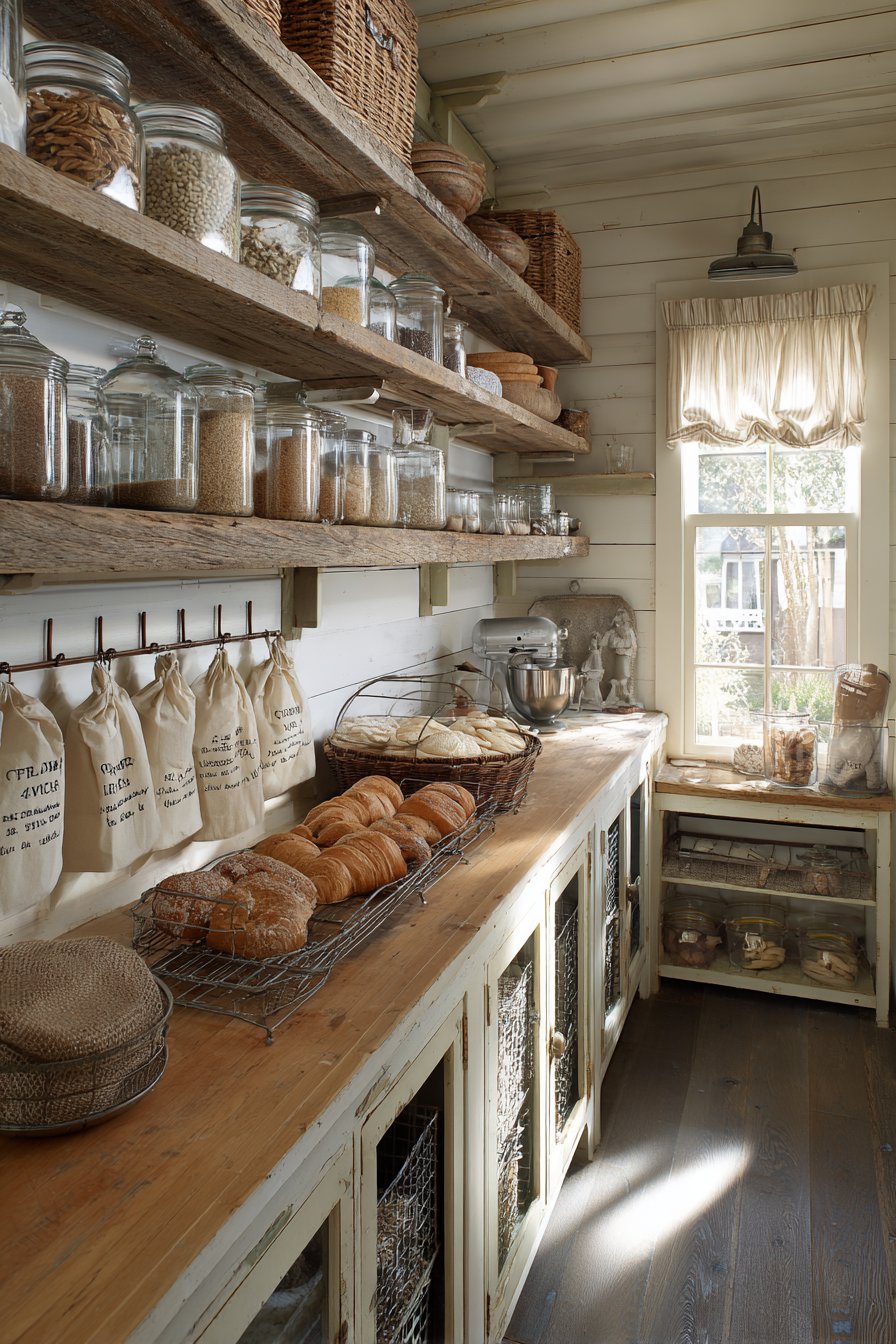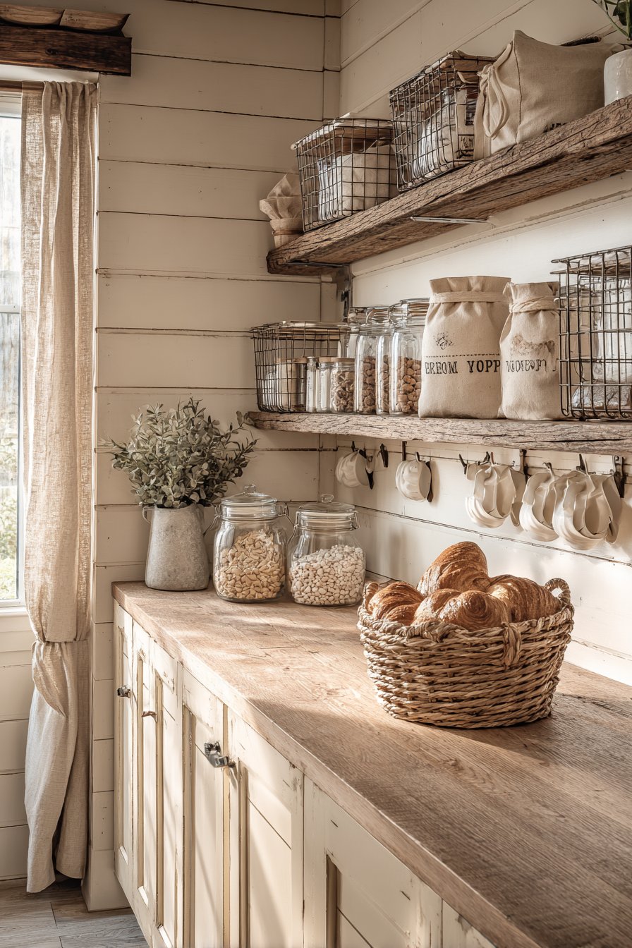 Glass apothecary jars store baking essentials with nostalgic beauty. A butcher block countertop provides an essential prep surface and warmth. Distressed cream-painted cabinetry underneath offers additional closed storage. Wrought iron hooks display cotton market bags and vintage measuring cups.