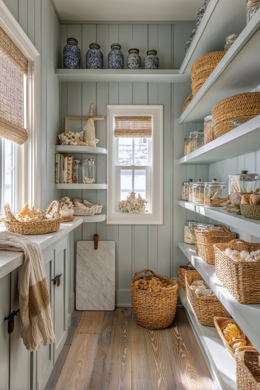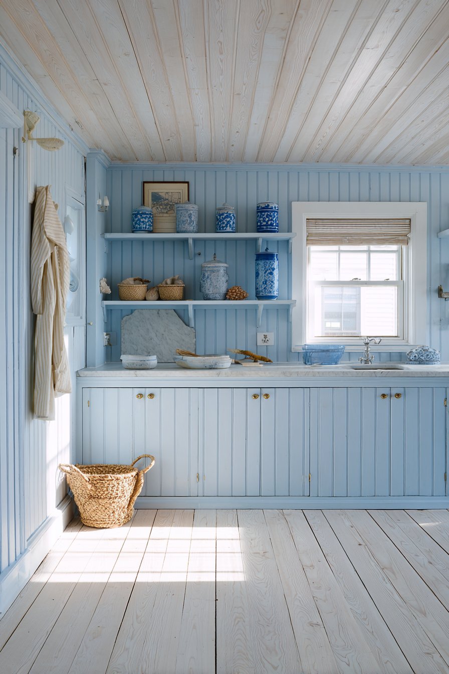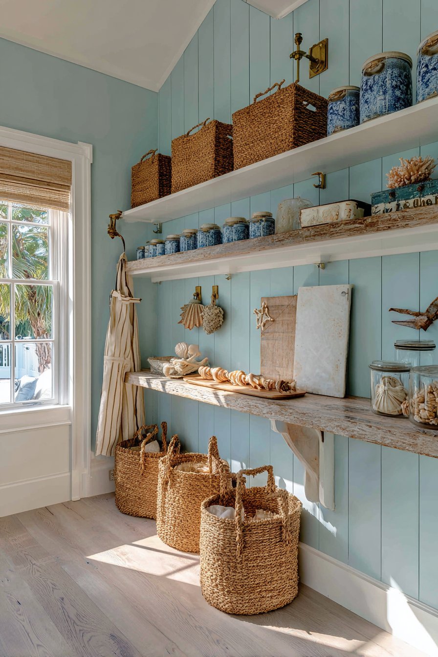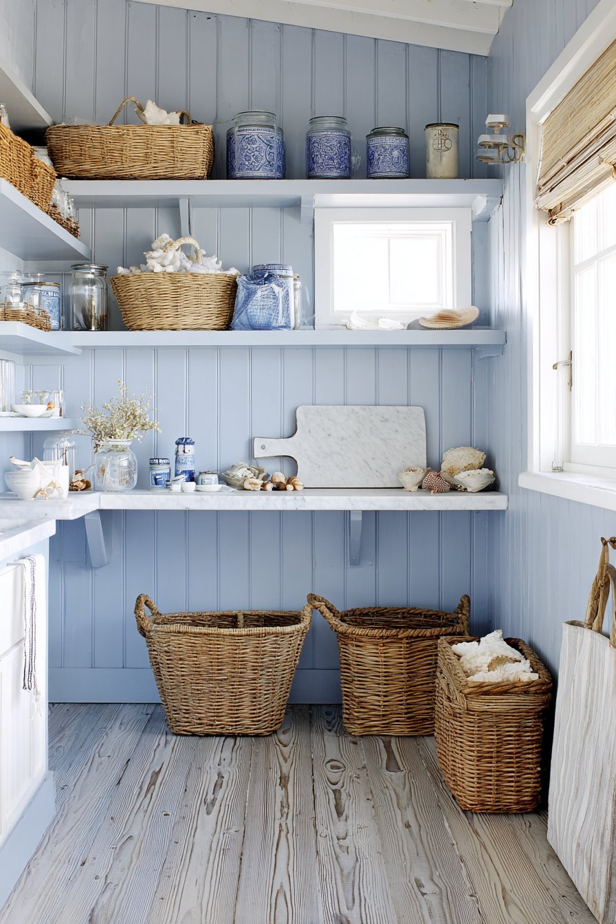 Beadboard paneling painted in soft powder blue evokes seaside charm. Natural rope-handled baskets provide casual storage with coastal character. The color palette immediately creates relaxed, breezy atmosphere. Open shelving in weathered white-washed pine adds rustic texture.