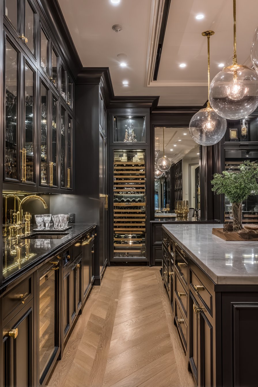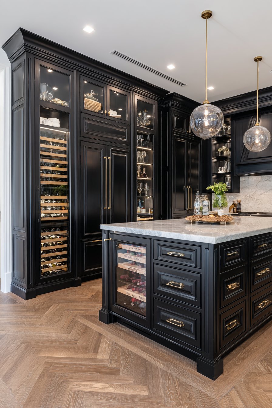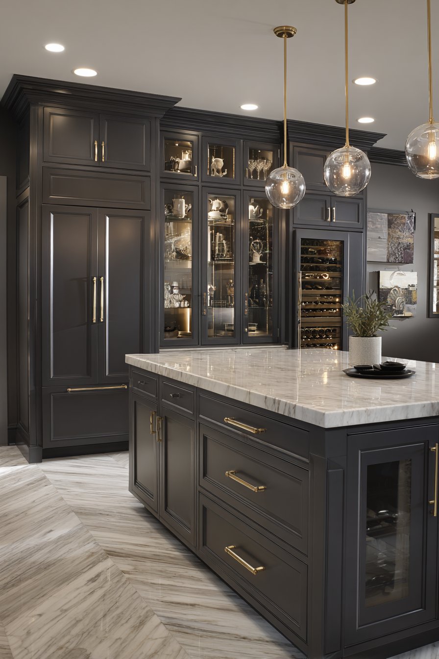 Custom cabinetry in deep charcoal creates dramatic sophisticated foundation. Inset panel doors show exceptional craftsmanship and attention to detail. Polished nickel hardware adds refined metallic accent throughout. An island-style center unit features honed Carrara marble countertop.