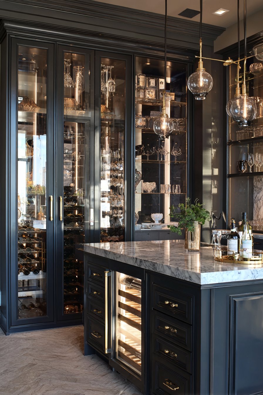 Glass-front cabinets with interior lighting showcase curated collections. Serving pieces and glassware become display-worthy objects. A wine refrigerator integrates seamlessly into custom cabinetry. Pull-out drawers reveal felt-lined sections for special items.