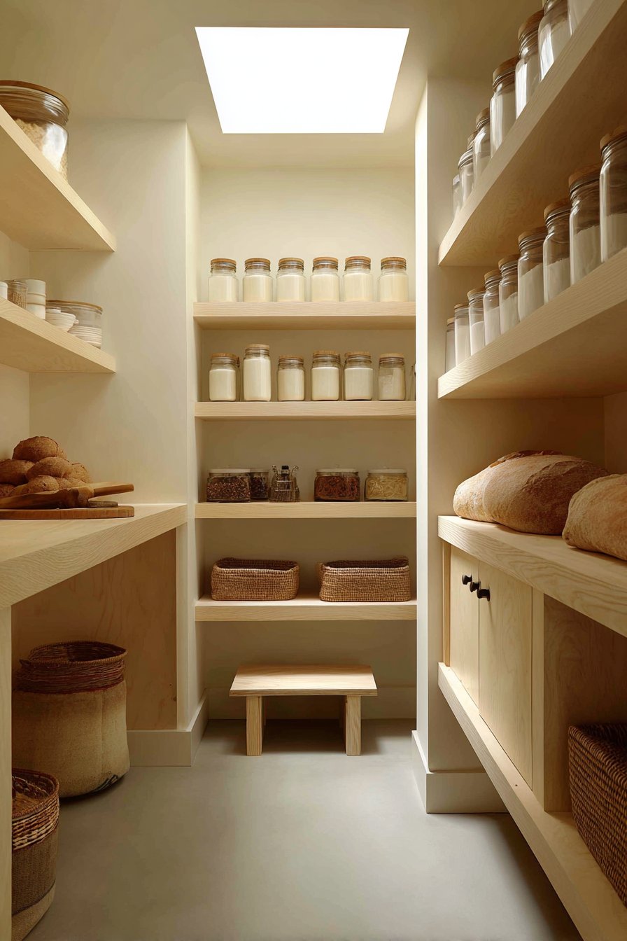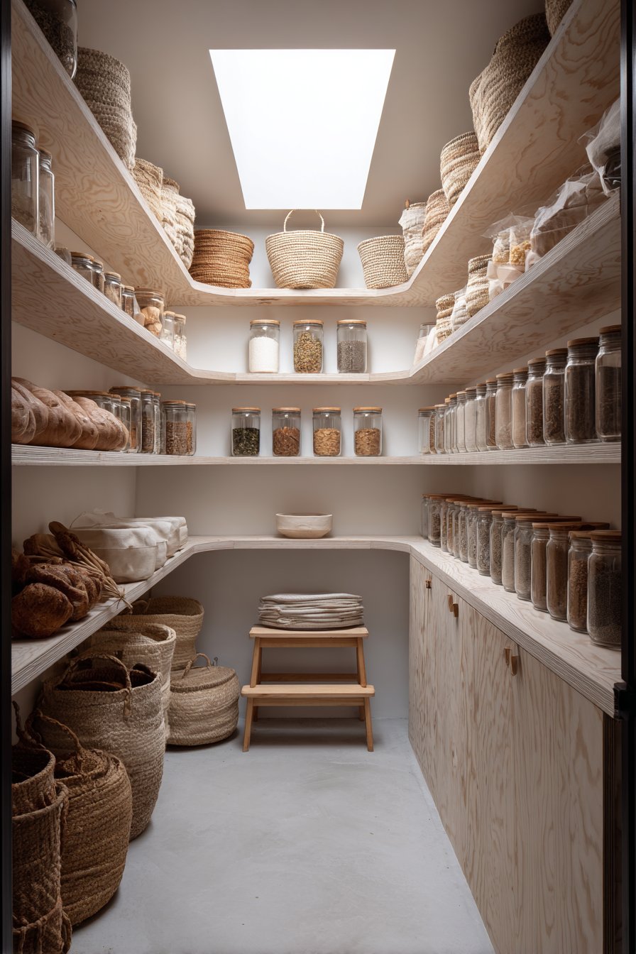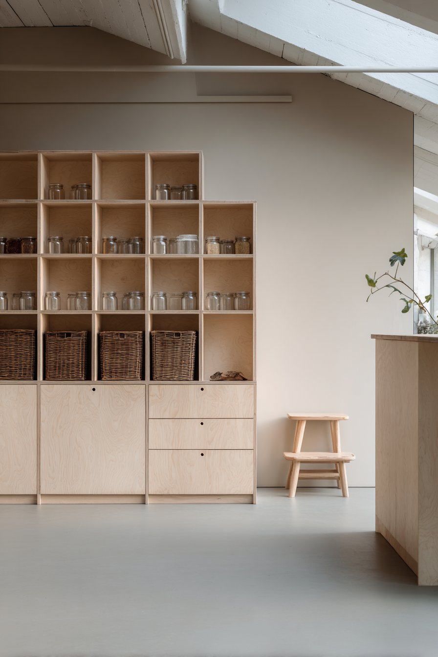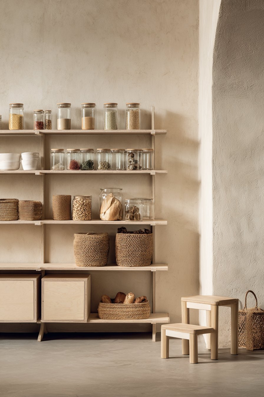 Light birch plywood shelving displays visible edge grain beautifully. The natural warmth of wood creates inviting organic atmosphere. Storage combines open shelves with closed lower cabinets seamlessly. Uniform glass containers with wood lids maintain cohesive aesthetic.