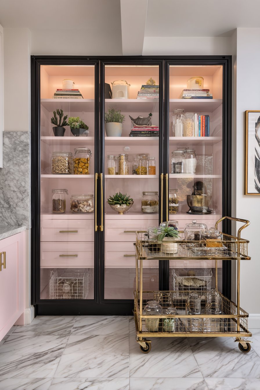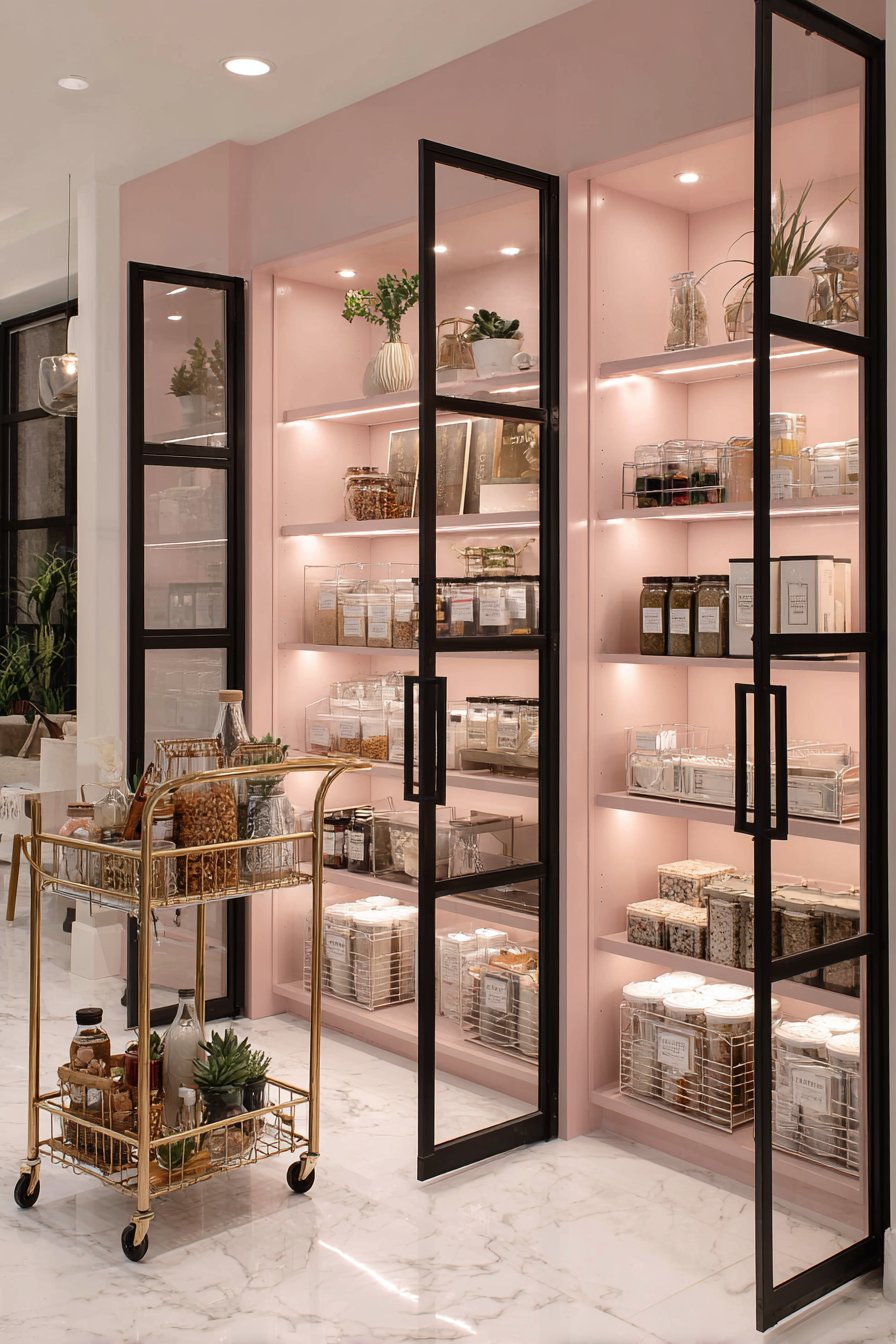 Black-framed glass doors create boutique retail aesthetic. Inside, shelving systems painted in soft blush pink add feminine charm. Chrome wire baskets and acrylic organizers create retail-inspired displays. The transparent materials keep the space feeling open and light.