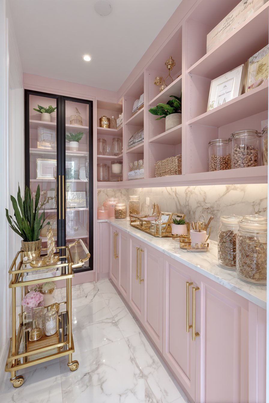 Under-shelf LED lighting creates warm glow throughout the space. The curated aesthetic feels Instagram-worthy yet highly functional. This design proves organization can be both pretty and practical. The feminine color palette adds personality without overwhelming the space.