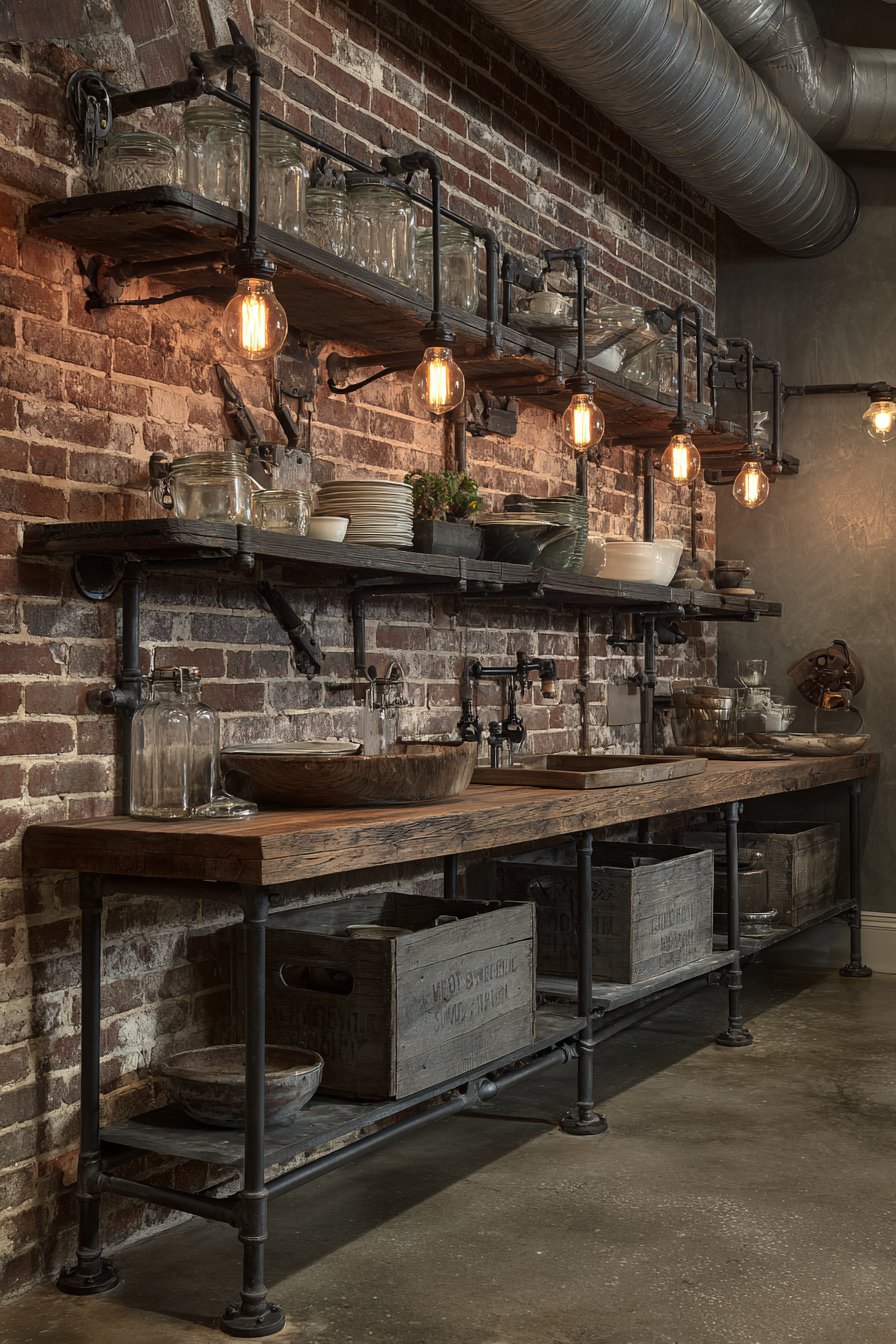Salvaged wooden crates add warmth to the industrial palette. Edison bulb pendant lights hang from black cord dramatically. Warm pools of light create ambiance in the utilitarian space. A salvaged wood plank countertop rests on metal pipe legs.