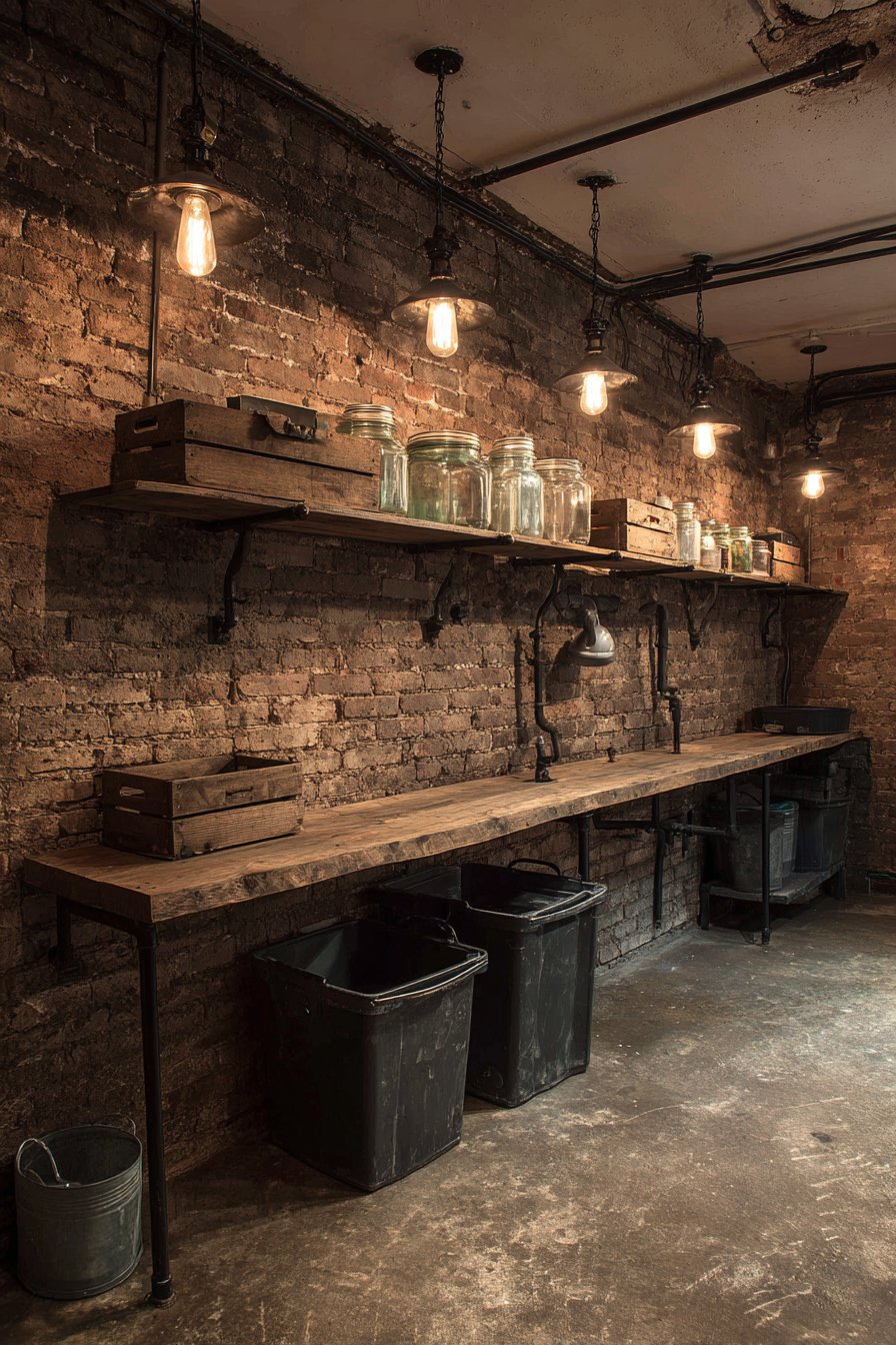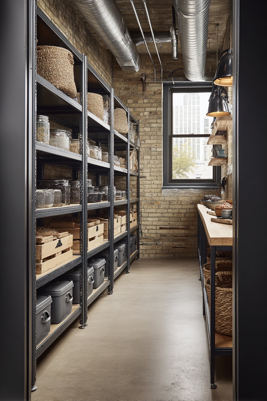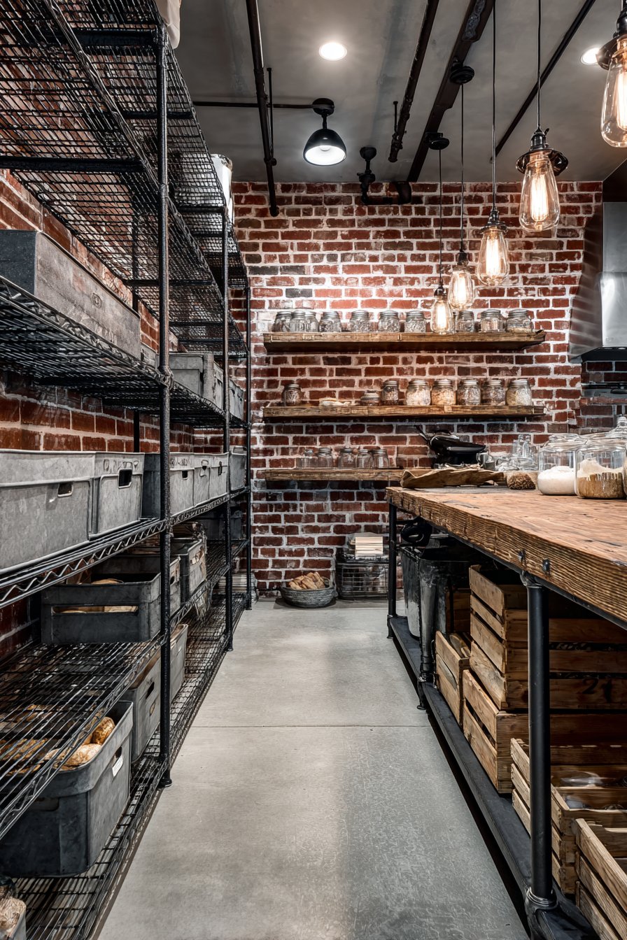 Exposed brick walls provide an authentic urban industrial backdrop. Heavy-duty metal shelving in matte black adds utilitarian strength. The contrast between rough brick and smooth metal creates interest. Galvanized metal bins offer storage with vintage industrial character.