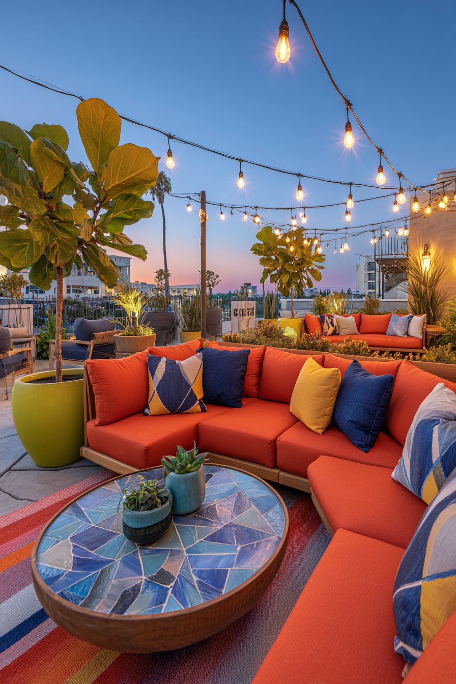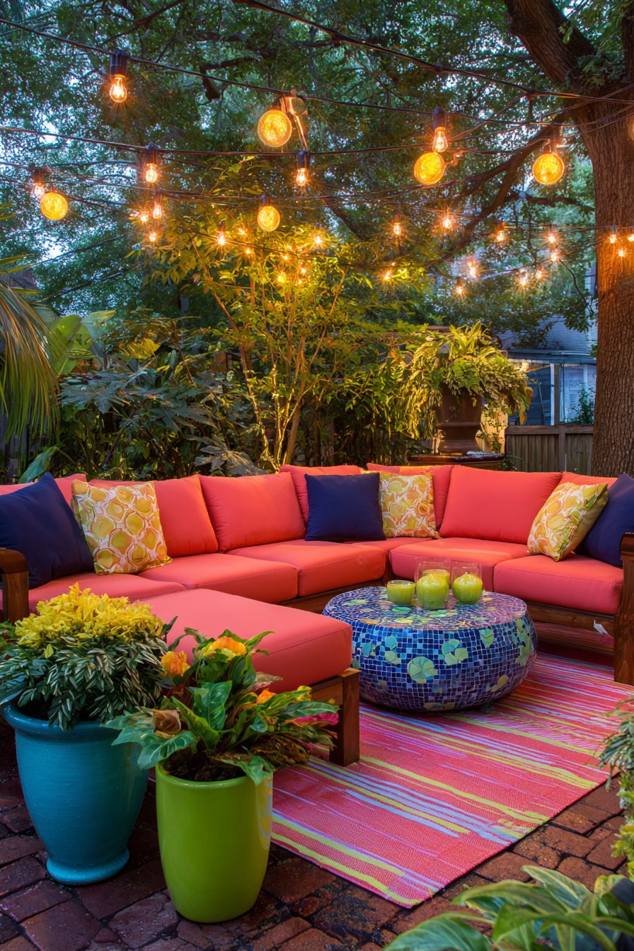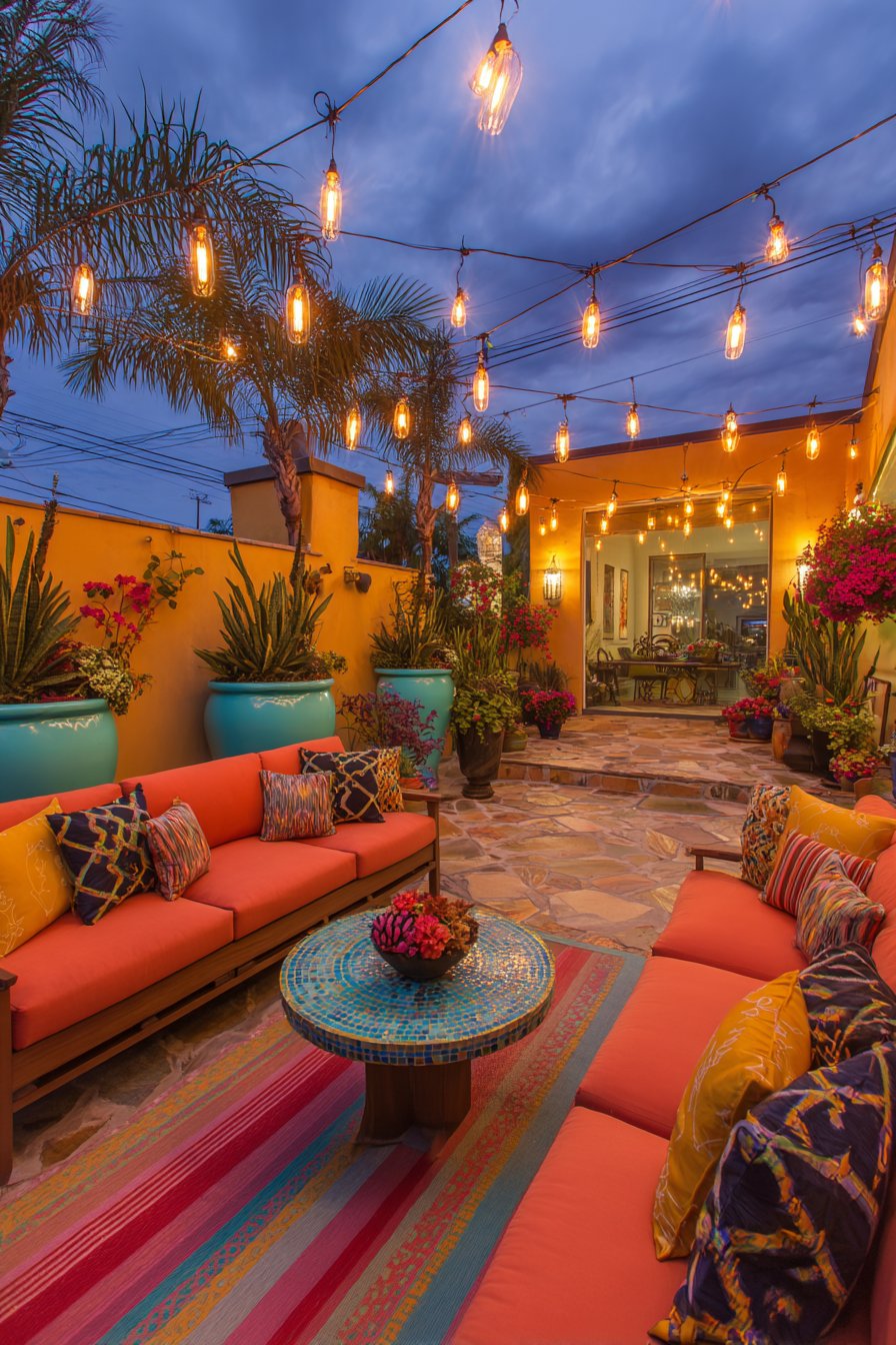 Tropical plants in ceramic planters introduce natural elements alongside bold design choices. Lime green and cobalt blue glazed containers flank the seating area. String lights with Edison bulbs crisscross overhead. Golden hour lighting enhances saturated colors and creates inviting ambiance.