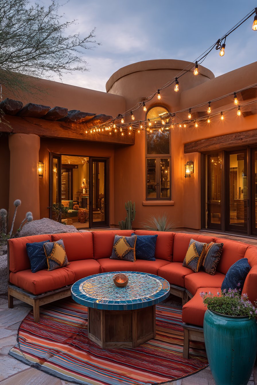 The round mosaic coffee table becomes a functional art piece at the seating area’s center. Turquoise and terracotta tiles form intricate patterns. A colorful striped outdoor rug in red, orange, and pink grounds the arrangement. The layered textiles add depth and visual interest to the space.