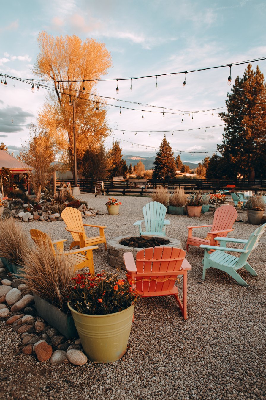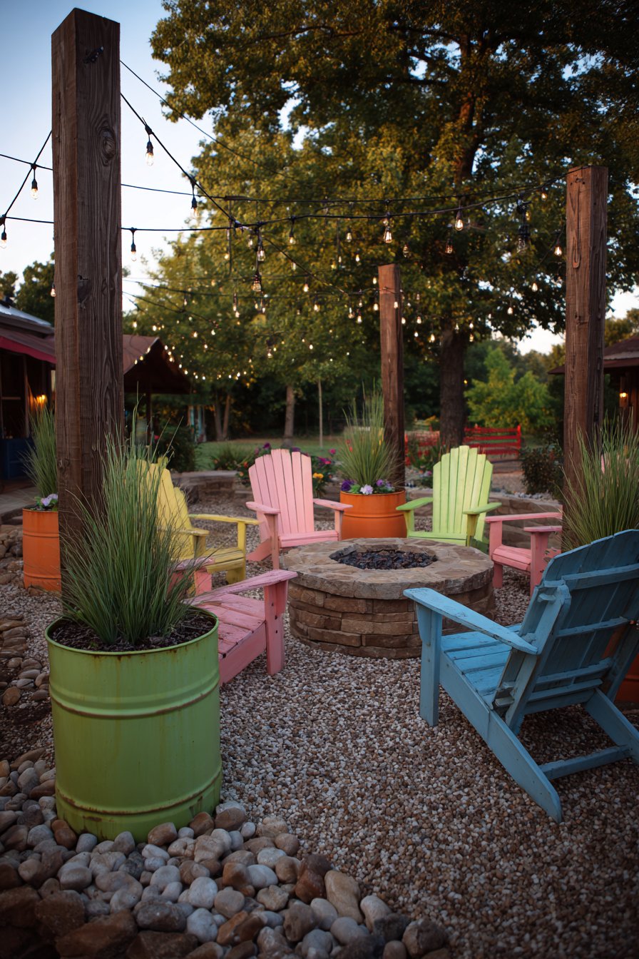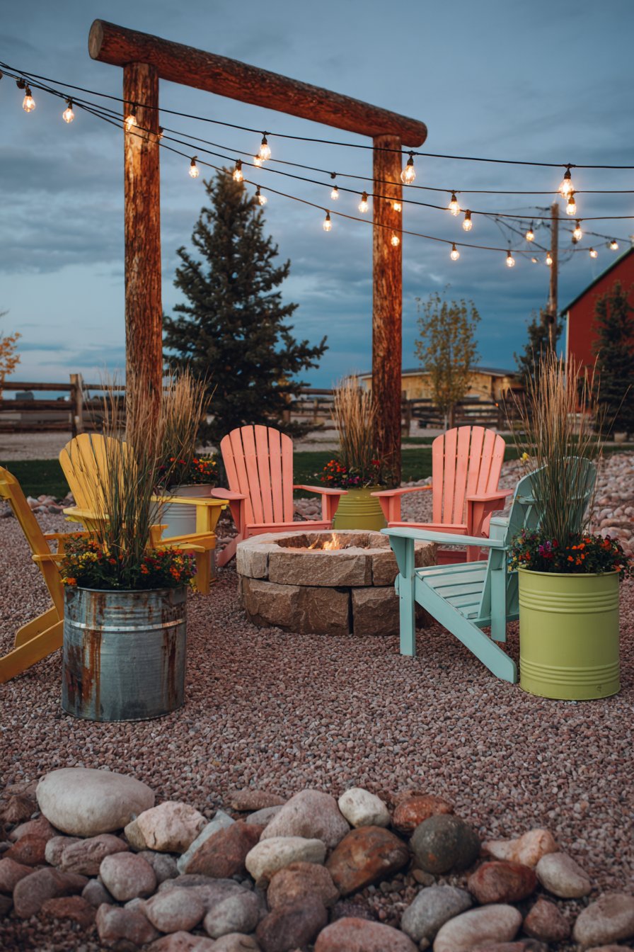 Adirondack chairs painted in butter yellow, robin’s egg blue, coral pink, and mint green circle a stone fire pit. Each cheerful hue brings individual personality. The chairs sit on pea gravel patio mixed with larger river rocks.