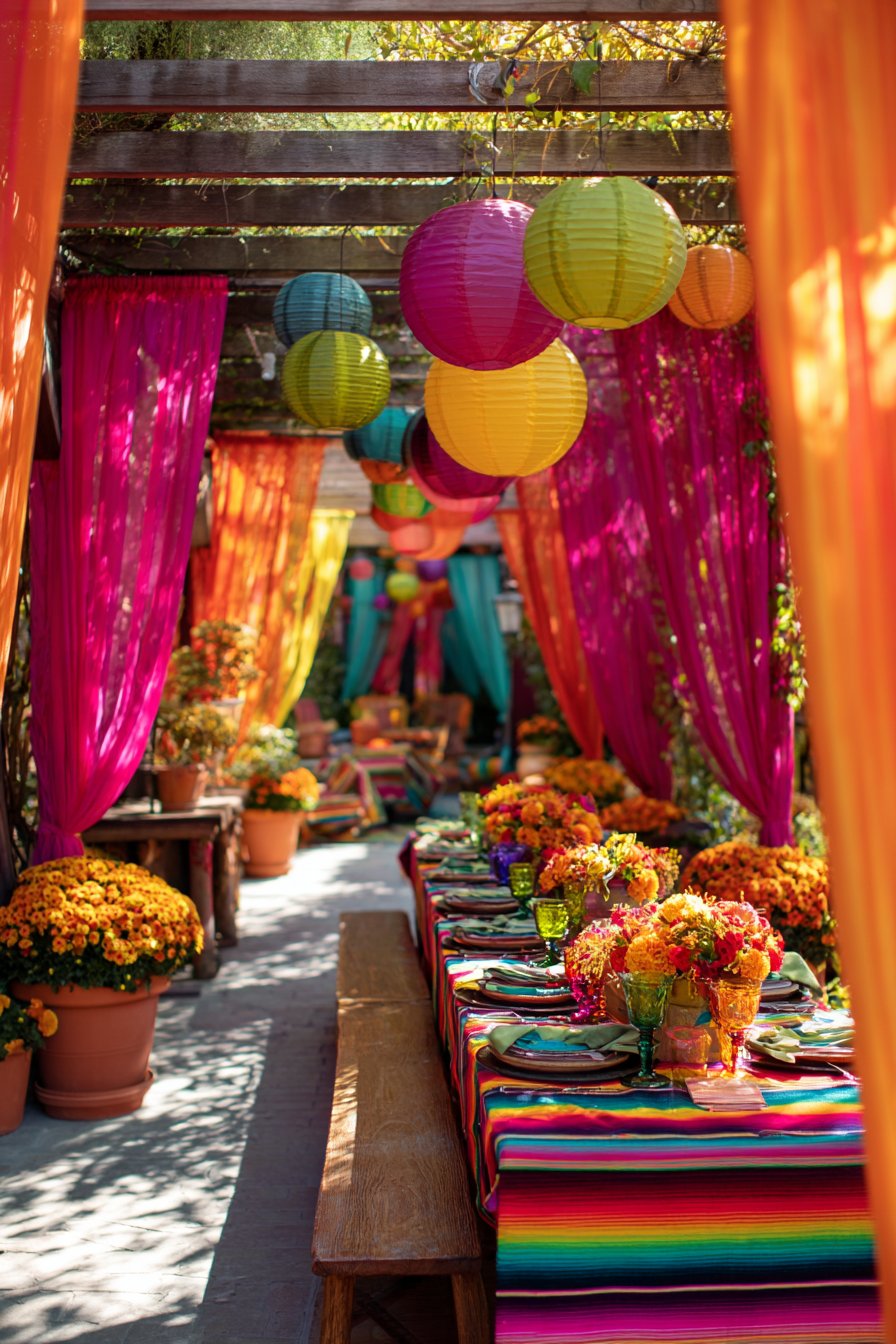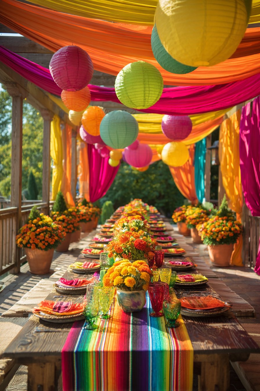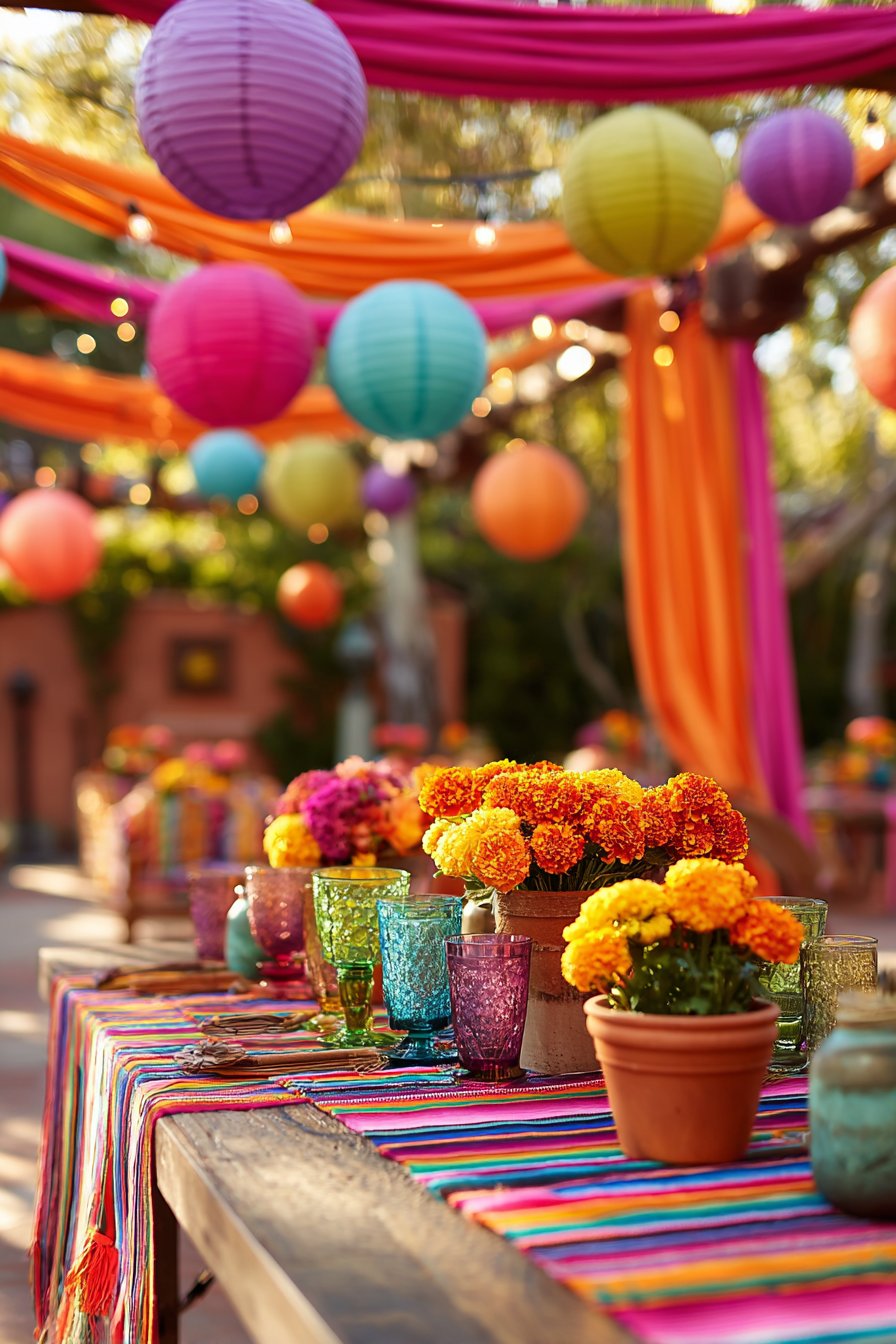 Potted marigolds and zinnias in terra cotta pots line the festive space. The traditional containers ground the exuberant color scheme. Golden hour natural lighting creates warm ambiance perfect for celebrations.