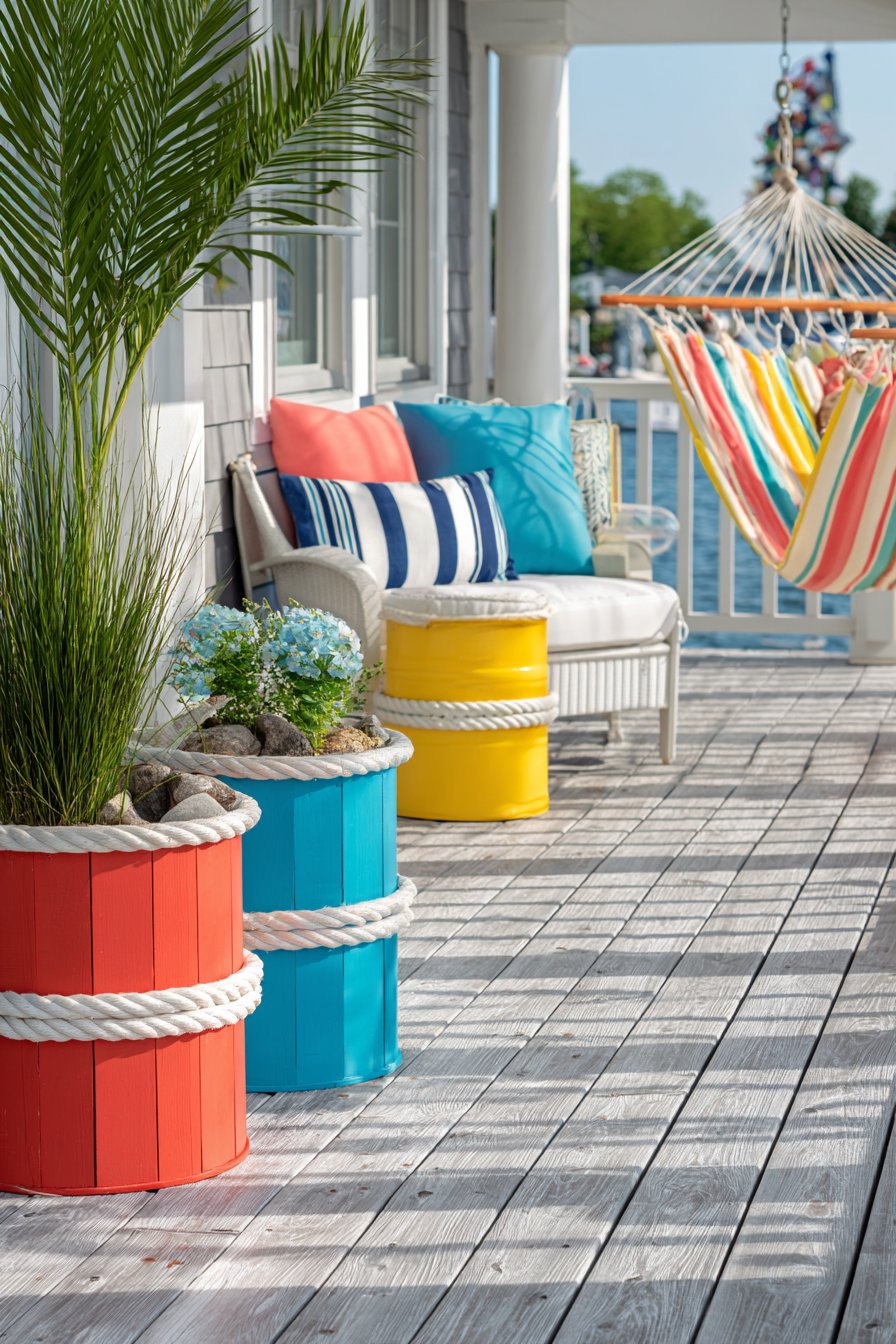 Nautical rope details in bright white wrap deck posts decoratively. The traditional maritime element feels fresh in contemporary context. Planters made from colorful recycled buoys in red, orange, and turquoise hold beach grasses and succulents.