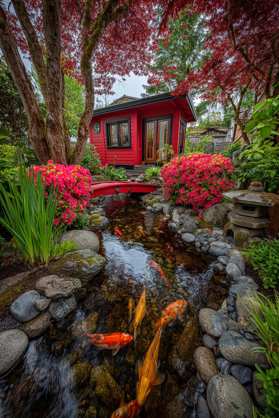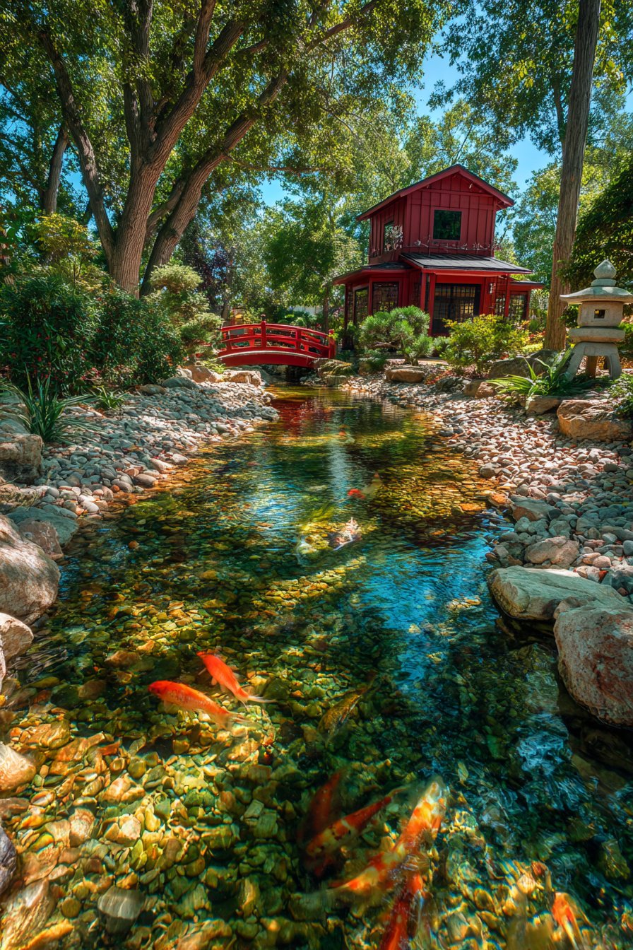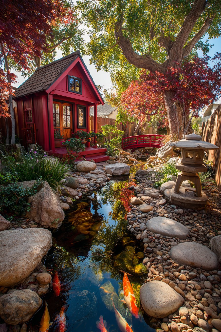 Soft morning light creates serene atmosphere throughout the zen garden. The tranquil colorful Asian-inspired design balances vibrant accents with neutral elements. Reflective water surface doubles visual impact of colorful fish.