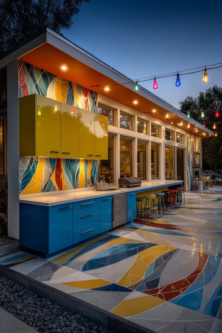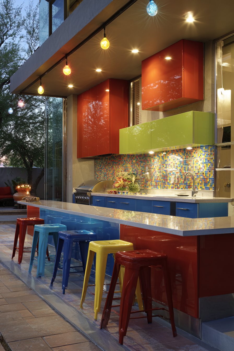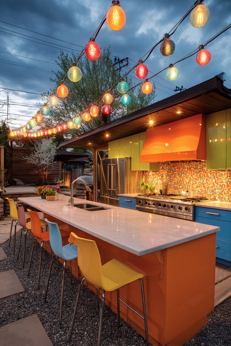 Bar stools in molded plastic in mixed primary colors line the outdoor counter. String lights with colored bulbs in rainbow sequence illuminate the cooking space. Evening lighting shows the illuminated, colorful kitchen against darkening sky.
