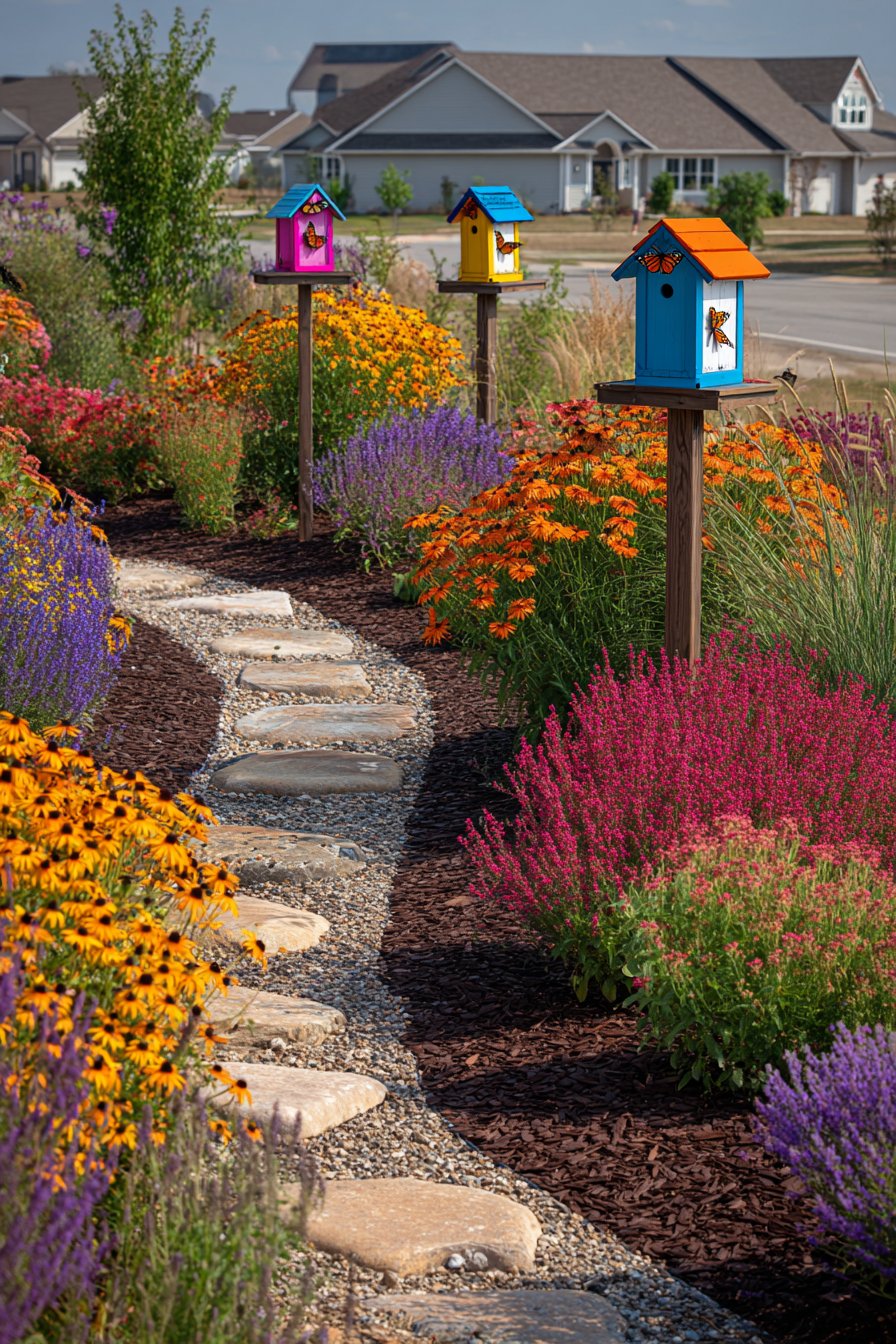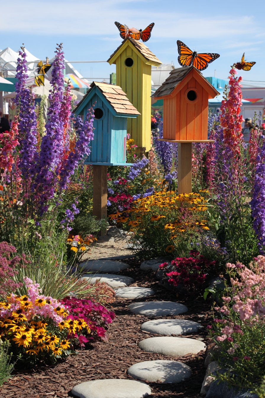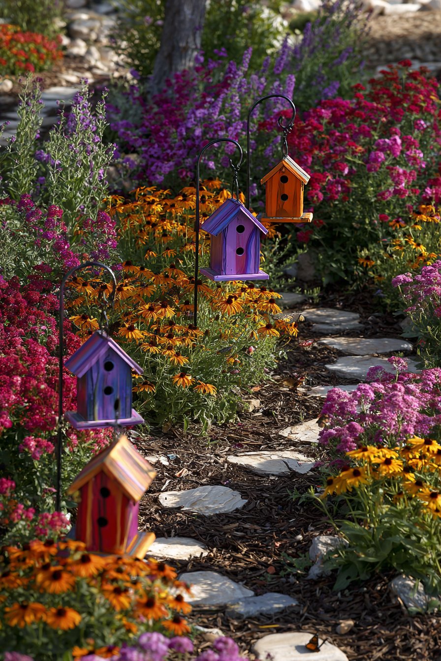 Decorative butterfly houses painted in bright primary colors hang from shepherd’s hooks. These functional shelters become garden art. A winding mulch path in dark brown provides contrast to vibrant blooms.