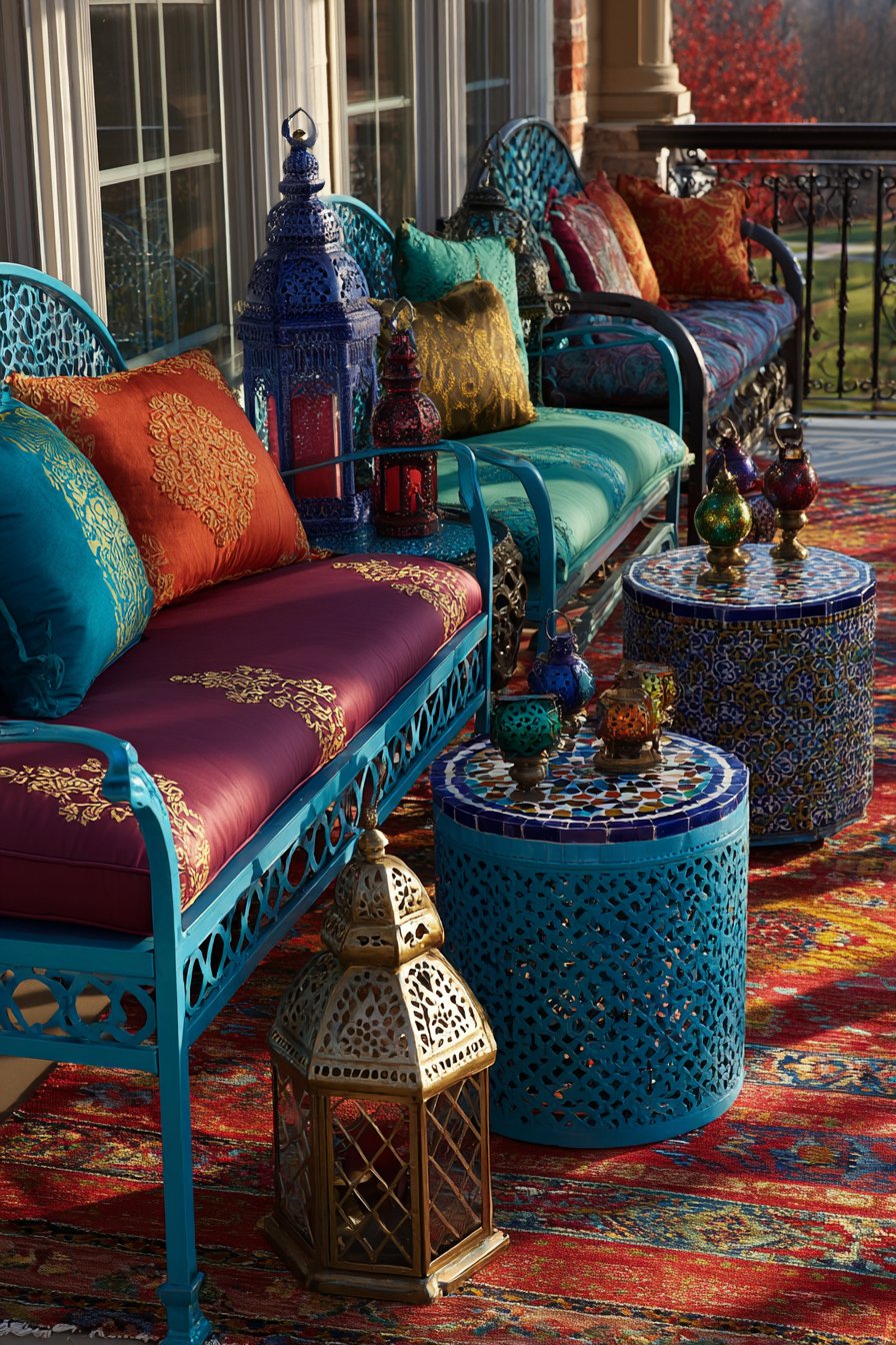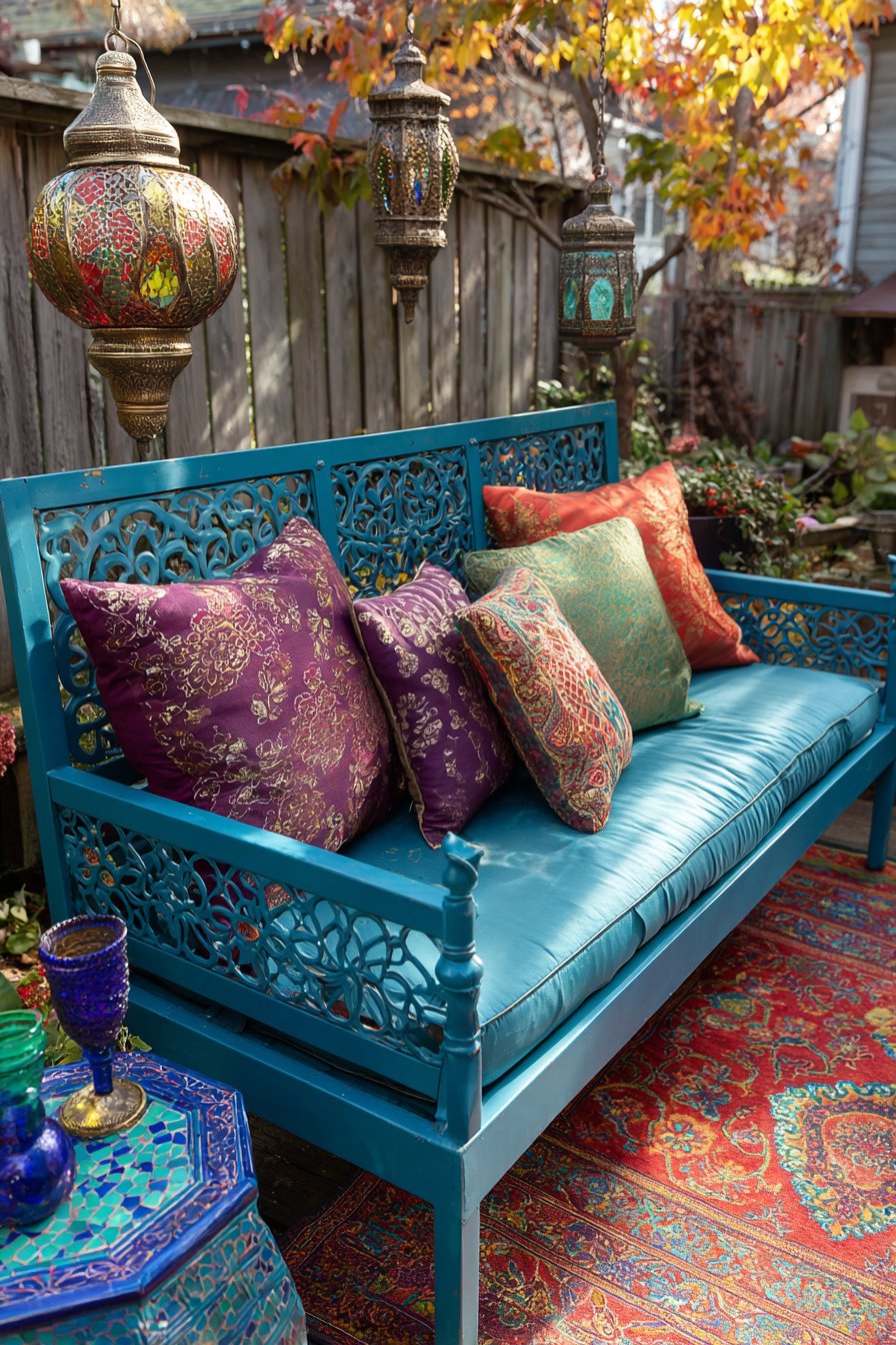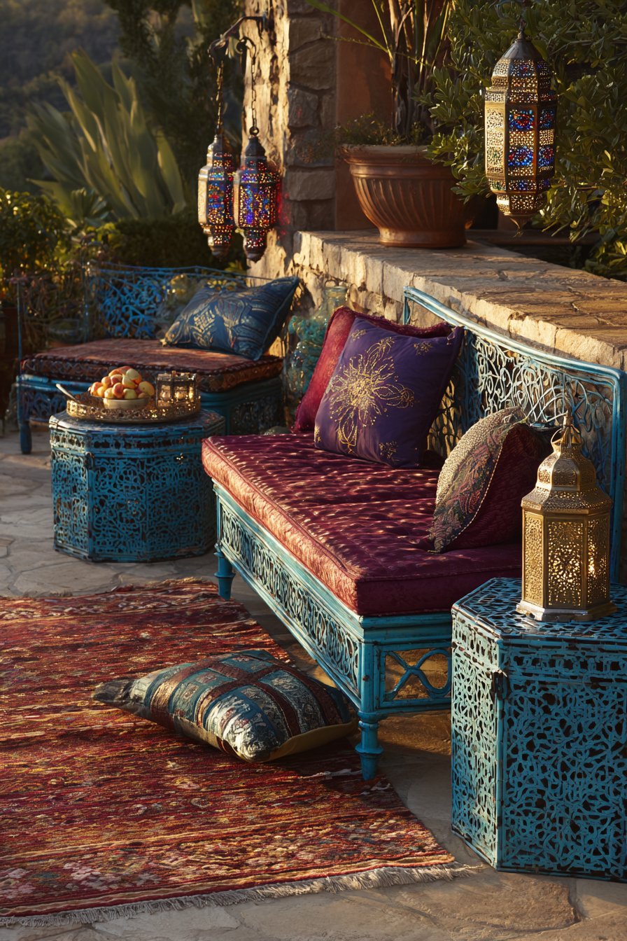 Ornate metal furniture painted in brilliant peacock blue features intricate cutout patterns. The craftsmanship creates shadow patterns throughout the day. Low seating with cushions and bolsters in emerald, ruby, sapphire, and amethyst fabrics adds luxurious comfort.