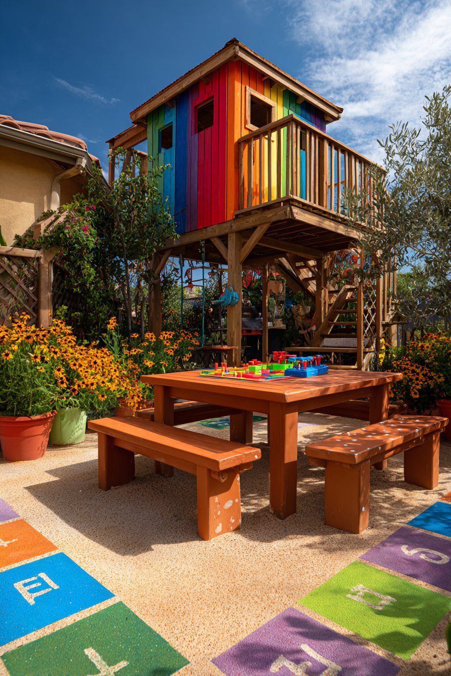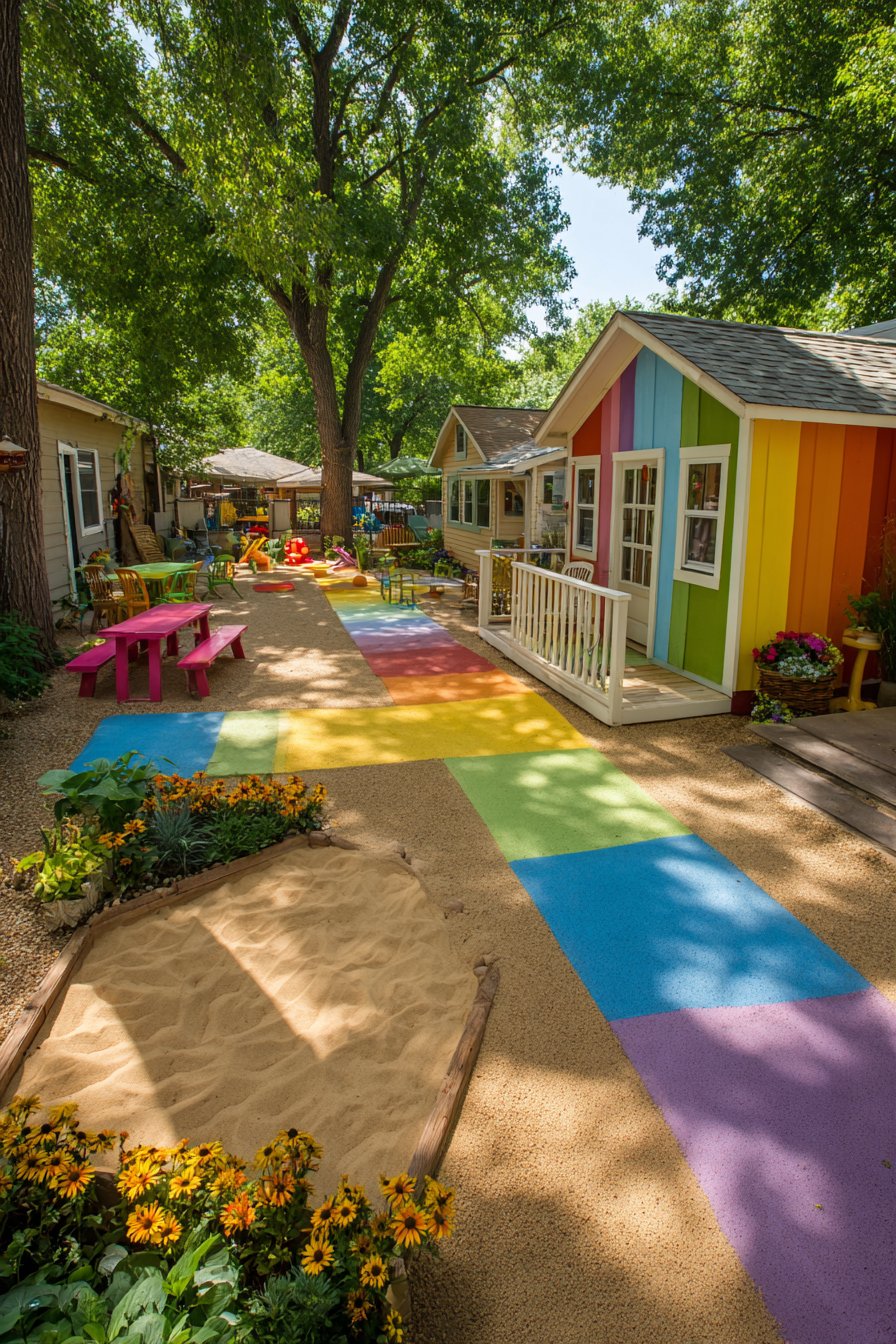A sandbox with bright primary colored plastic toys sits adjacent to the playhouse. Painted hopscotch grid on concrete in neon colors provides an active play opportunity. Garden beds planted with sunflowers, zinnias, and cosmos create living rainbow backdrop.