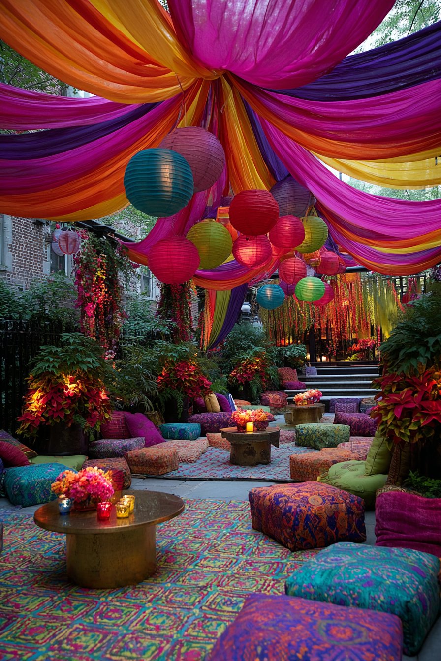 Layered colorful textiles define this party-ready design. The complete festive setup demonstrates how temporary elements transform ordinary spaces. Balanced exposure captures every colorful detail from fabric to flowers.