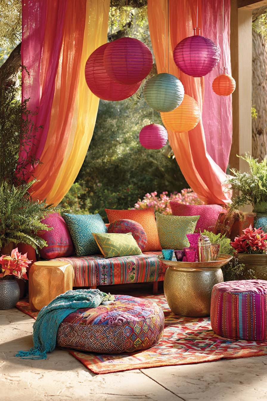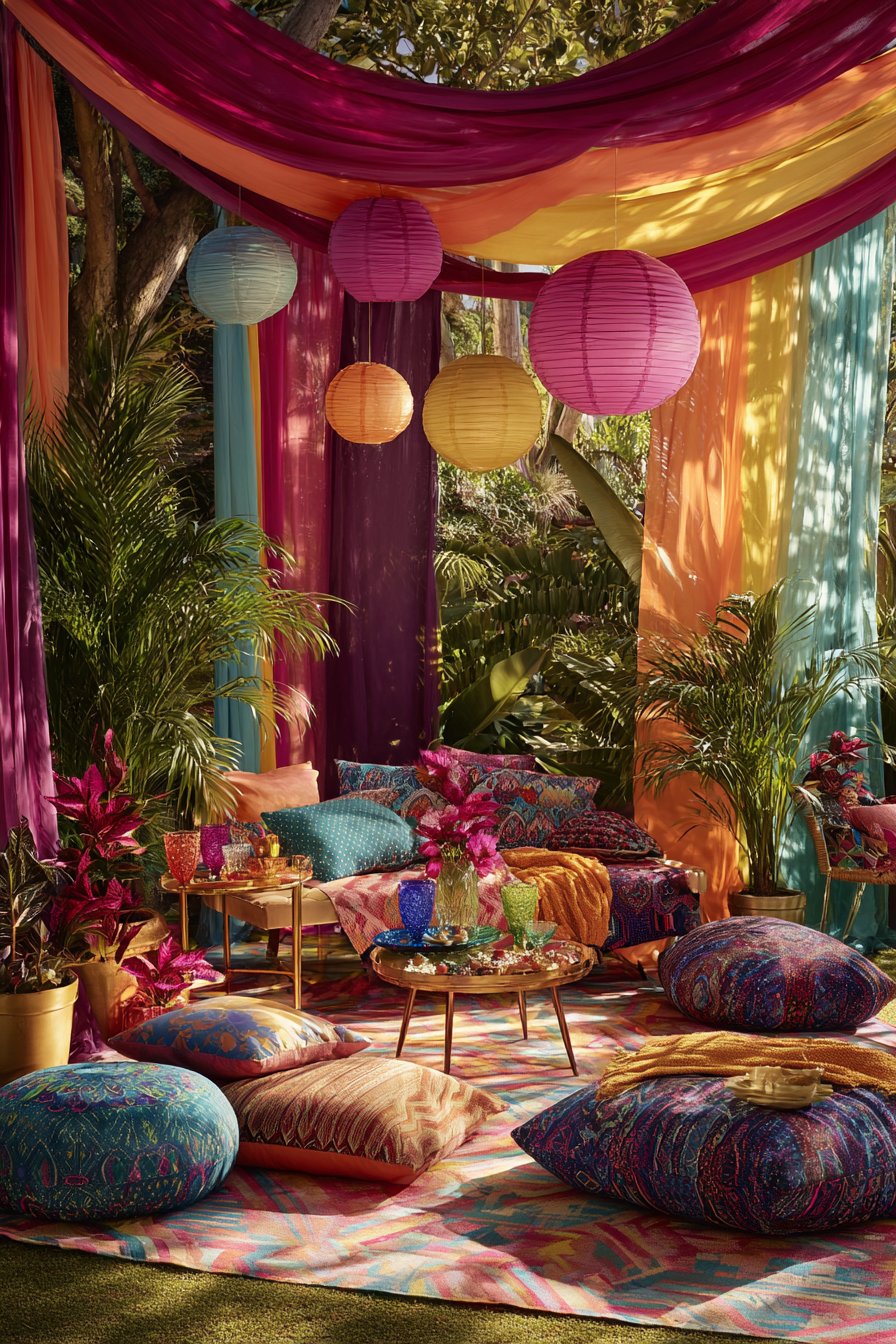 The bohemian festival atmosphere emerges through layered colorful textiles. Fabric drape and translucent qualities affect light throughout the day. Interior design photography captures the complete immersive color experience.