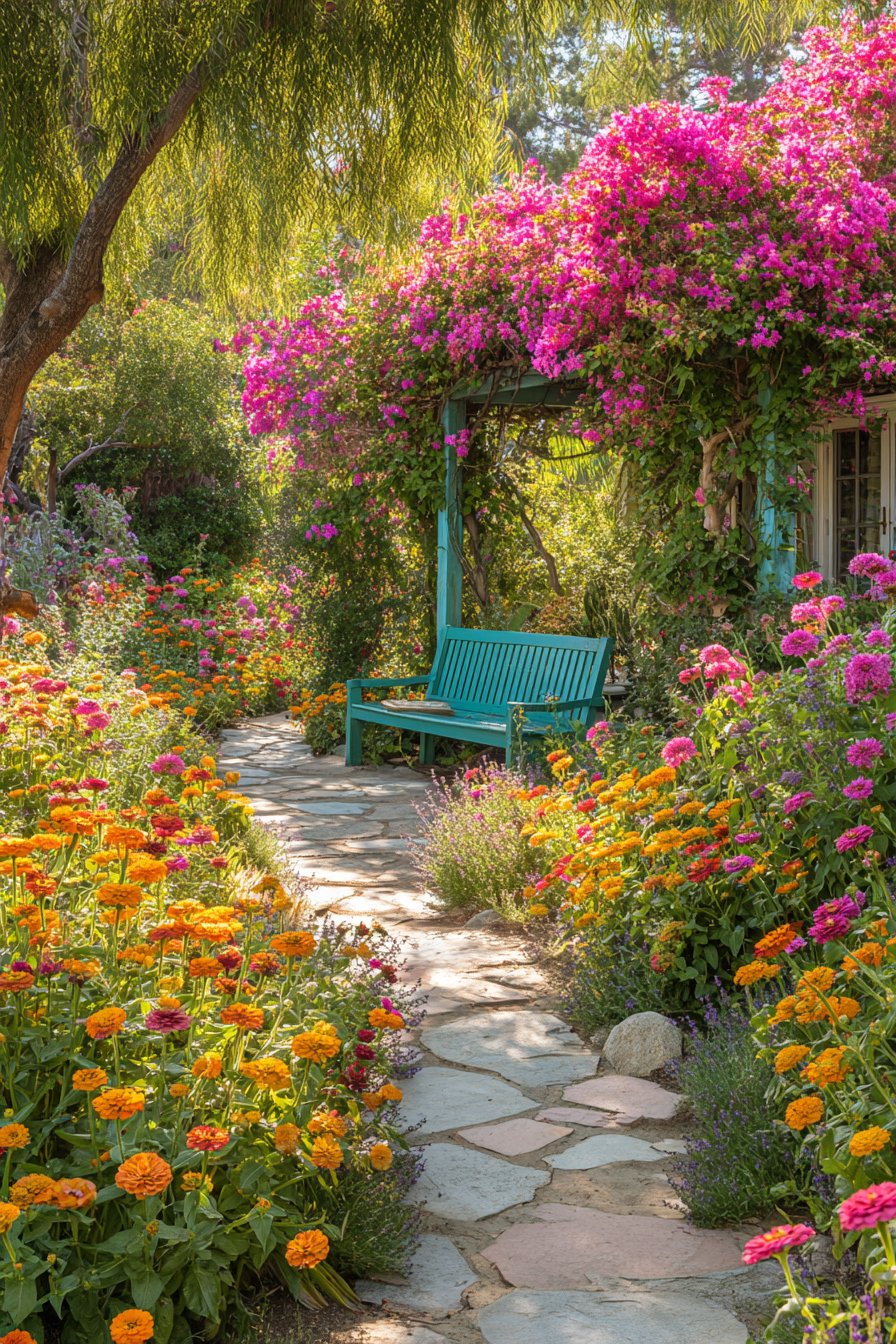 A vintage turquoise painted garden bench offers a resting spot beneath a flowering arbor. Pink climbing roses frame the seating area romantically. The bench color echoes the blue tones in the pathway stones. This repetition creates visual cohesion throughout the garden design.