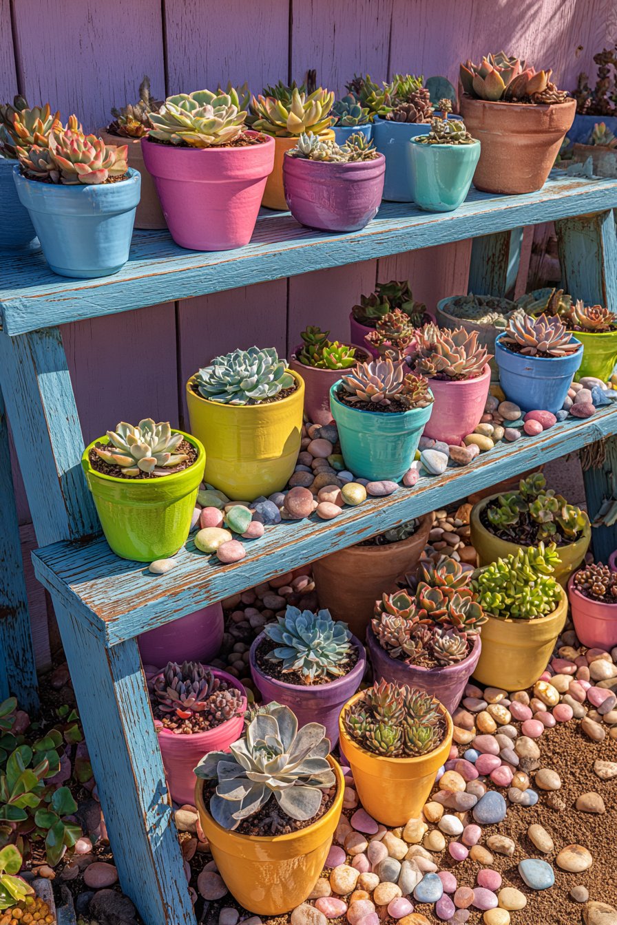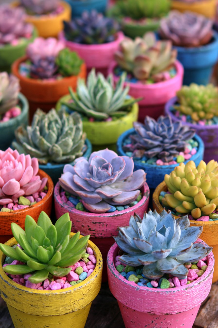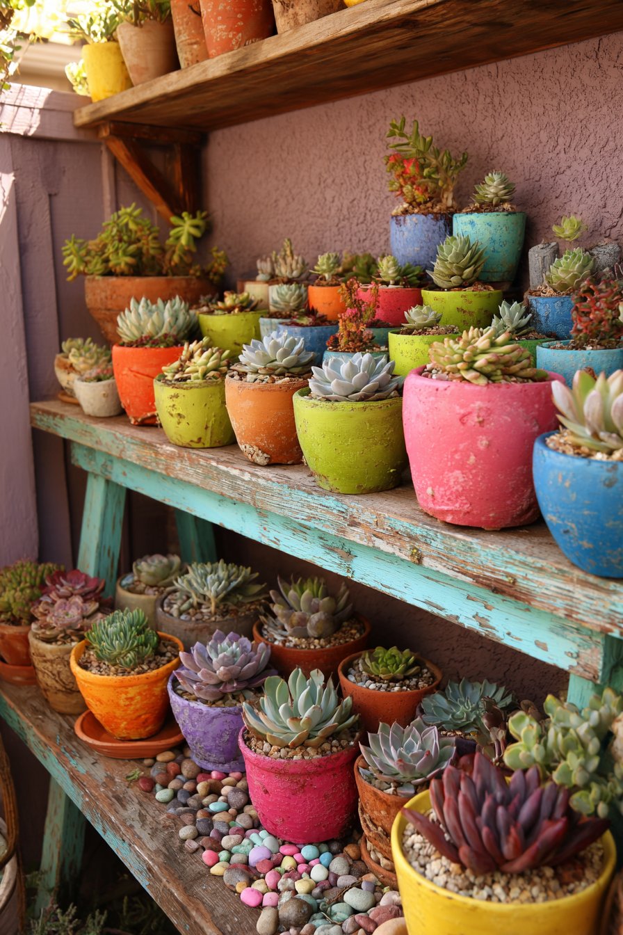 Dozens of succulent varieties fill terra cotta pots painted in bright acrylics. Hot pink, electric blue, lime green, tangerine orange, and grape purple transform ordinary containers. The succulents themselves show natural colors from blue-grey to burgundy to chartreuse.