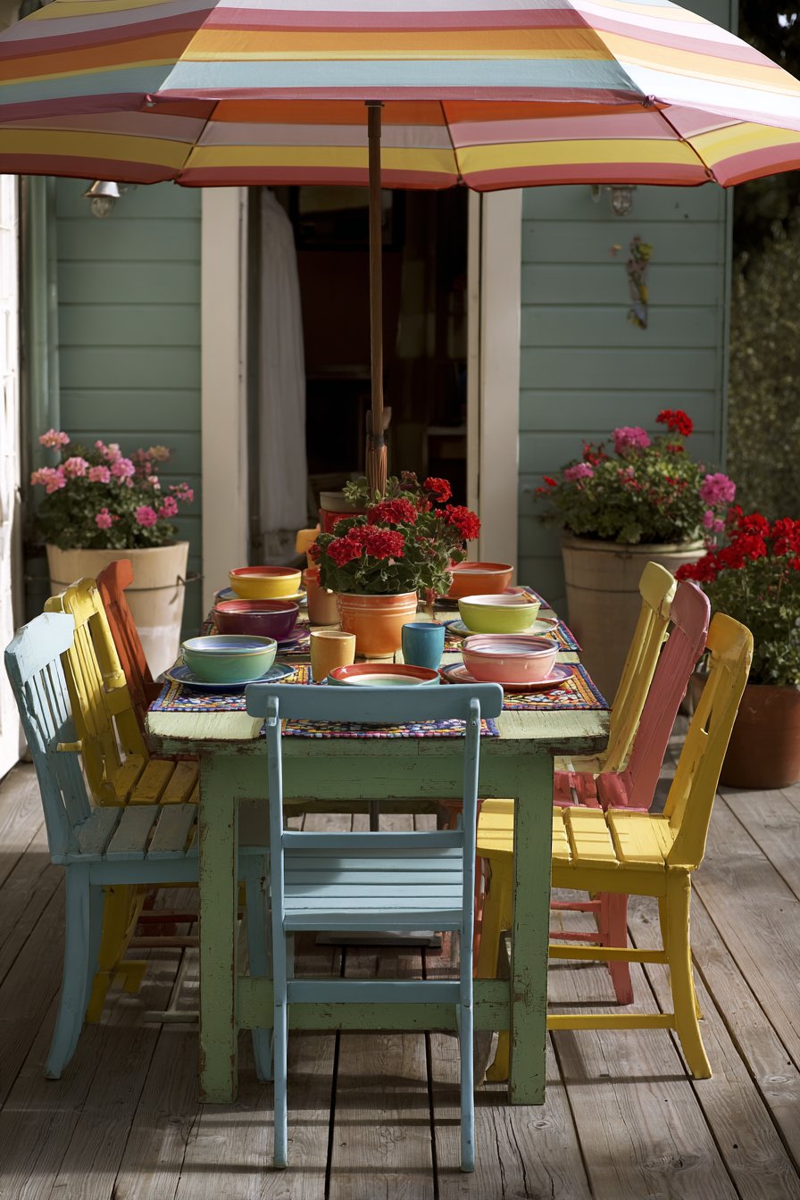 3. Eclectic Farmhouse Dining Under Striped Umbrellas