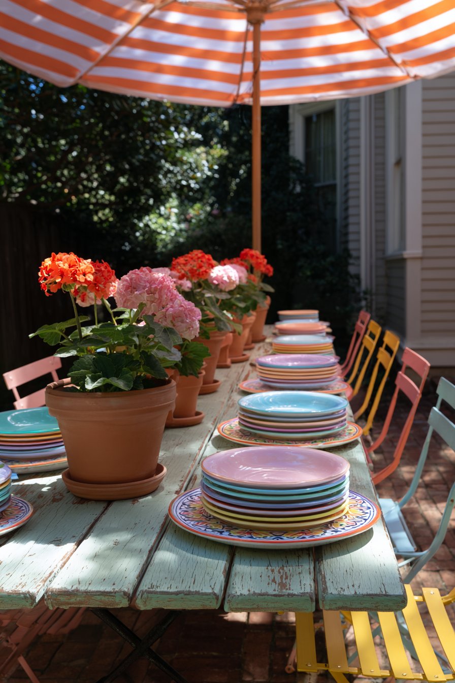 Potted geraniums in terra cotta pots add traditional red accents around the dining space. The natural clay containers ground the colorful scheme. Soft natural lighting highlights eclectic color combinations throughout the setup.