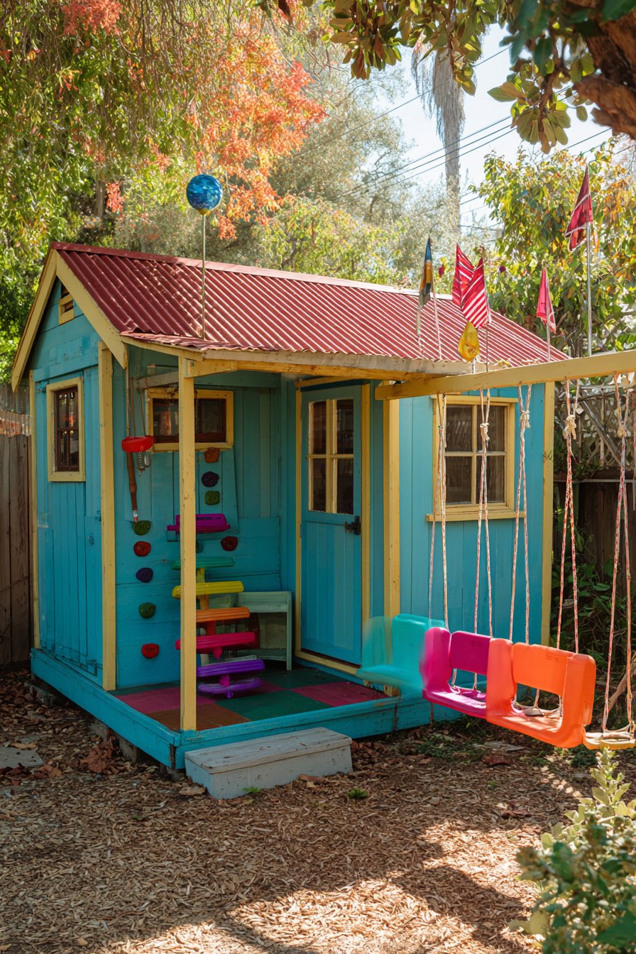 A custom-built wooden playhouse painted in bright sky blue with sunshine yellow trim becomes the backyard’s centerpiece. The red metal roof adds bold contrast. This structure captures childhood imagination through pure color joy.