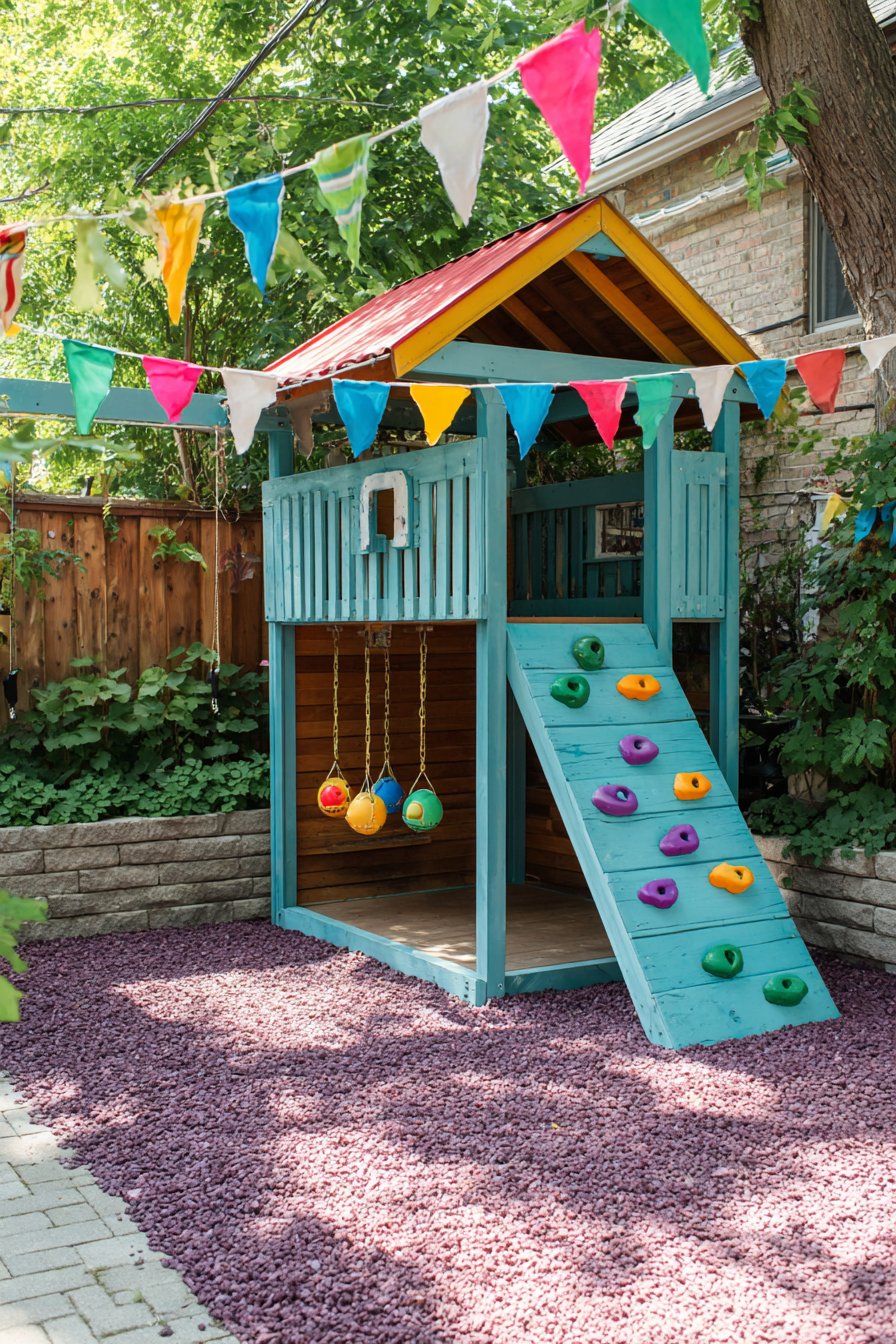 The playful multicolored backyard designed specifically for children demonstrates age-appropriate color use. Weather-resistant finishes ensure longevity. Photography balances painted surfaces and natural flower colors.