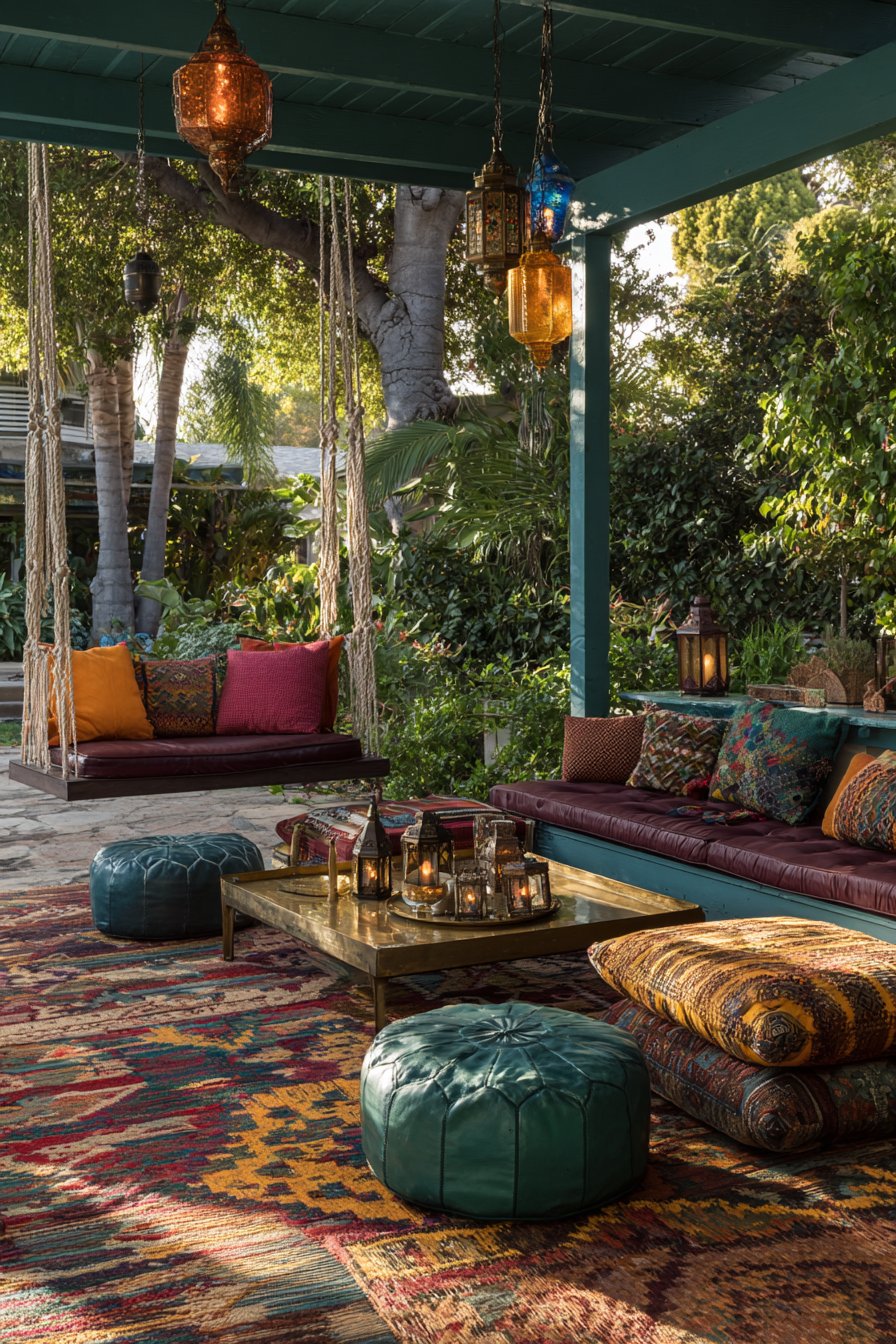 A hanging macramé chair with bright fuchsia and orange cushions suspends from a deep teal painted pergola. The chair becomes a sculptural focal point. Moroccan-style floor poufs in emerald green, sapphire blue, and burgundy leather surround a low brass tray table.