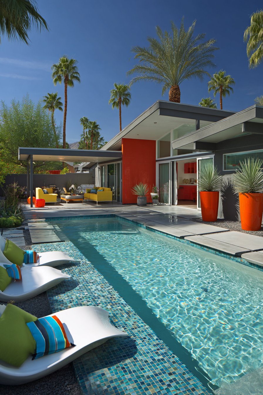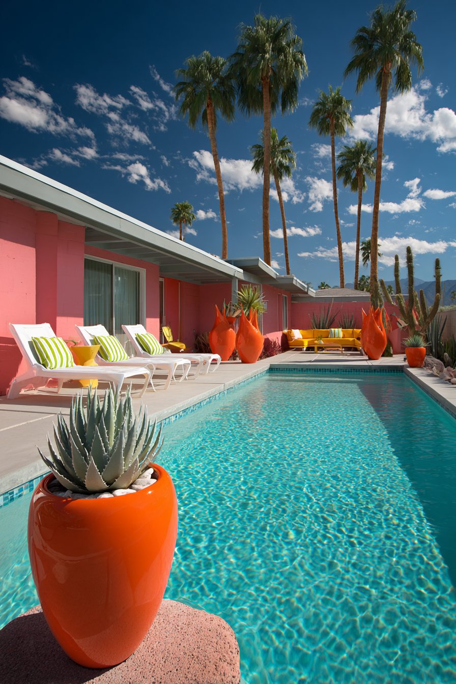 Midday lighting highlights vibrant pool water and saturated accent colors brilliantly. The clear sky enhances color saturation. Wide-angle perspective reveals intentional spatial relationships between colorful elements.